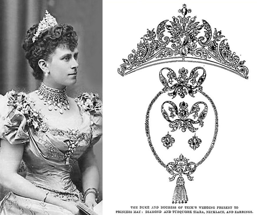 Let’s start with the turquoise tiara that belonged to everyone’s favorite British royal magpie, Queen Mary. From an early age, May loved turquoise, and her family members loved to present her with bejeweled gifts set with the stone. Her parents, the Duke and Duchess of Teck, gave her the Teck Turquoise Parure, an entire set of diamond and turquoise jewelry from the Duchess’s collection as a wedding present in 1893. In the portrait on the left, taken when she was Duchess of York, Mary wears the original tiara with several other pieces from the suite.