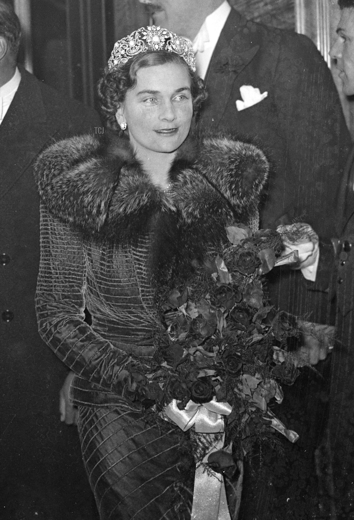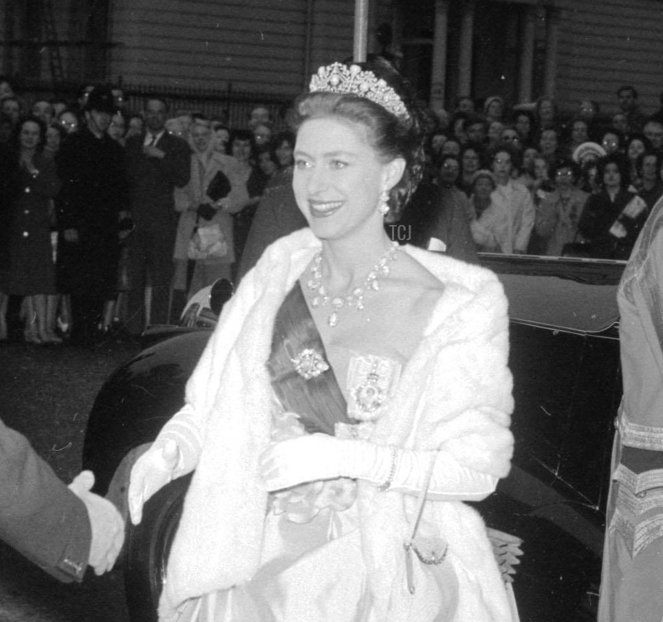 In 1912, Mary had the size of the tiara reduced slightly, removing the pointed top of the jewel. A little more than two decades later, she gave the entire suite to her newest daughter-in-law, Princess Alice, Duchess of Gloucester, as a wedding present. Above, Alice wears the tiara and earrings for the opening of the new Odeon Theatre in London’s Leicester Square on November 2, 1937.