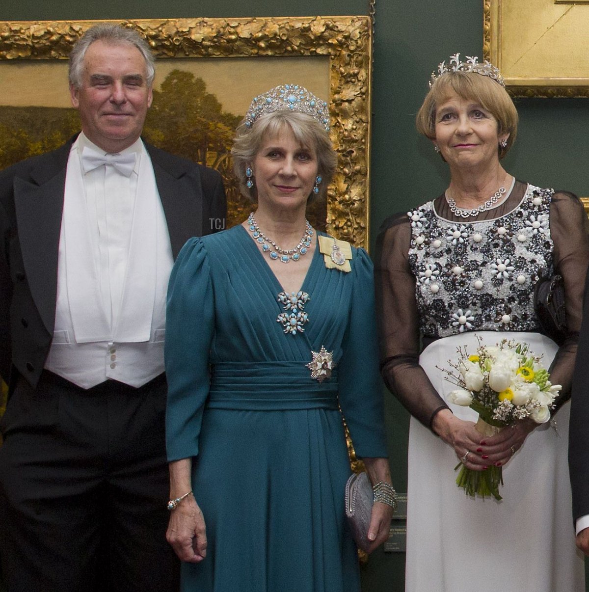 Today, the Teck Turquoise Tiara and its accompanying jewels are worn by Princess Alice’s daughter-in-law: Birgitte, the current Duchess of Gloucester. Above, she wears the tiara, earrings, necklace, and brooches for a banquet at the Guildhall in London during the 2015 state visit from the President of Mexico.