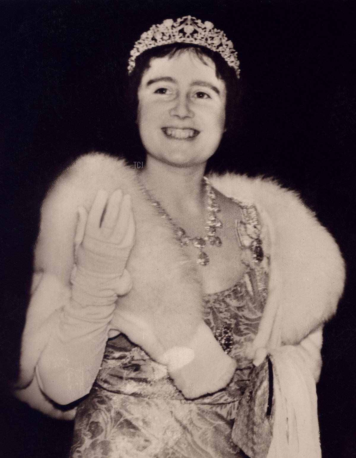 After receiving the jewels, the new Duchess of York decided to tinker a bit with the tiara. She had the top line of diamonds removed. She’s wearing the tiara in the adapted form in the image above, taken in the 1930s, shortly before she became Queen Elizabeth.