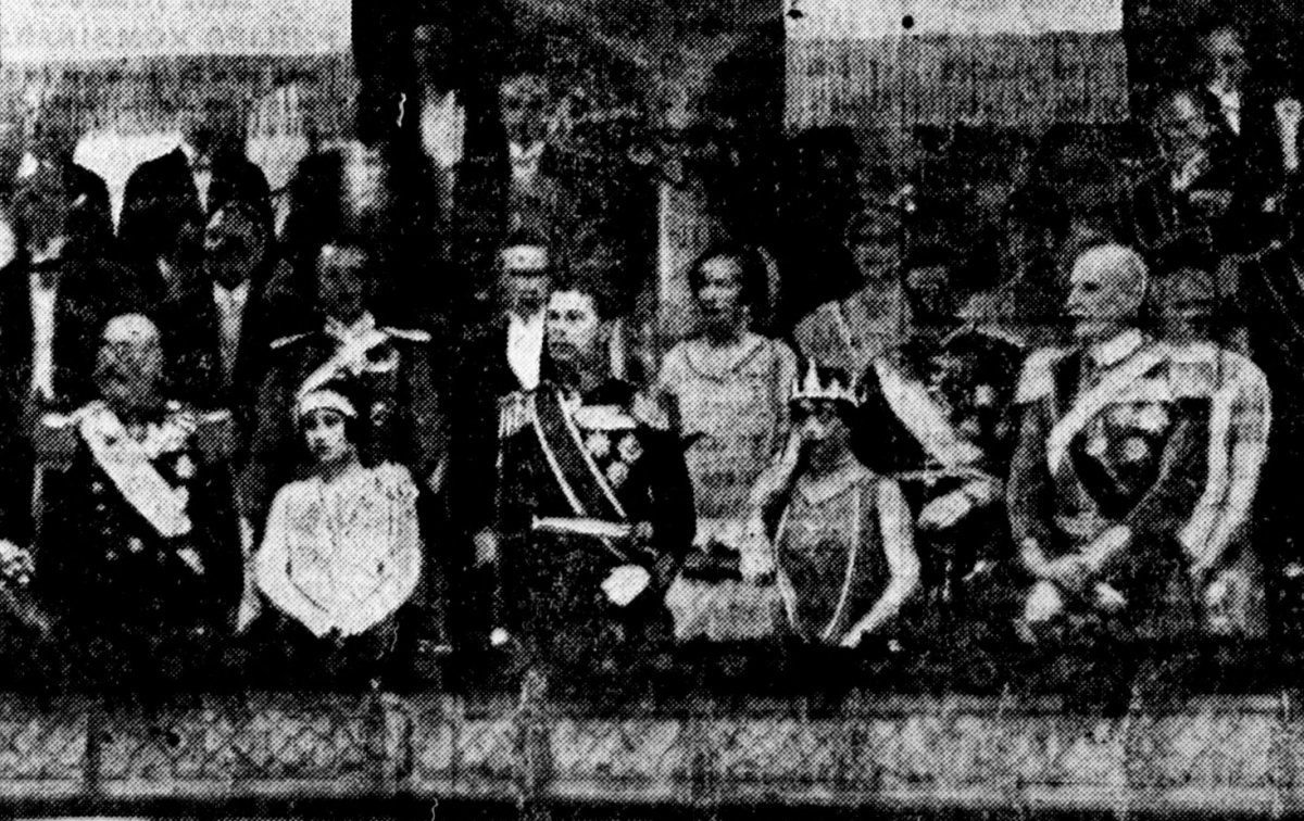 In March 1929, the Duchess of York (second from the left) wore her turquoise tiara for a pre-wedding gala at the National Theatre in Oslo, celebrating the wedding of Crown Prince Olav of Norway and Princess Märtha of Sweden. But hers wasn’t the only British royal turquoise tiara present at the event. Queen Maud of Norway (fourth from the left), who was born Princess Maud of Wales, wore a diamond and turquoise tiara that she had inherited from her mother, Queen Alexandra of the United Kingdom, in 1925.