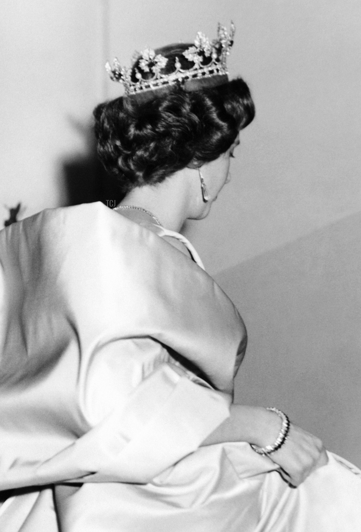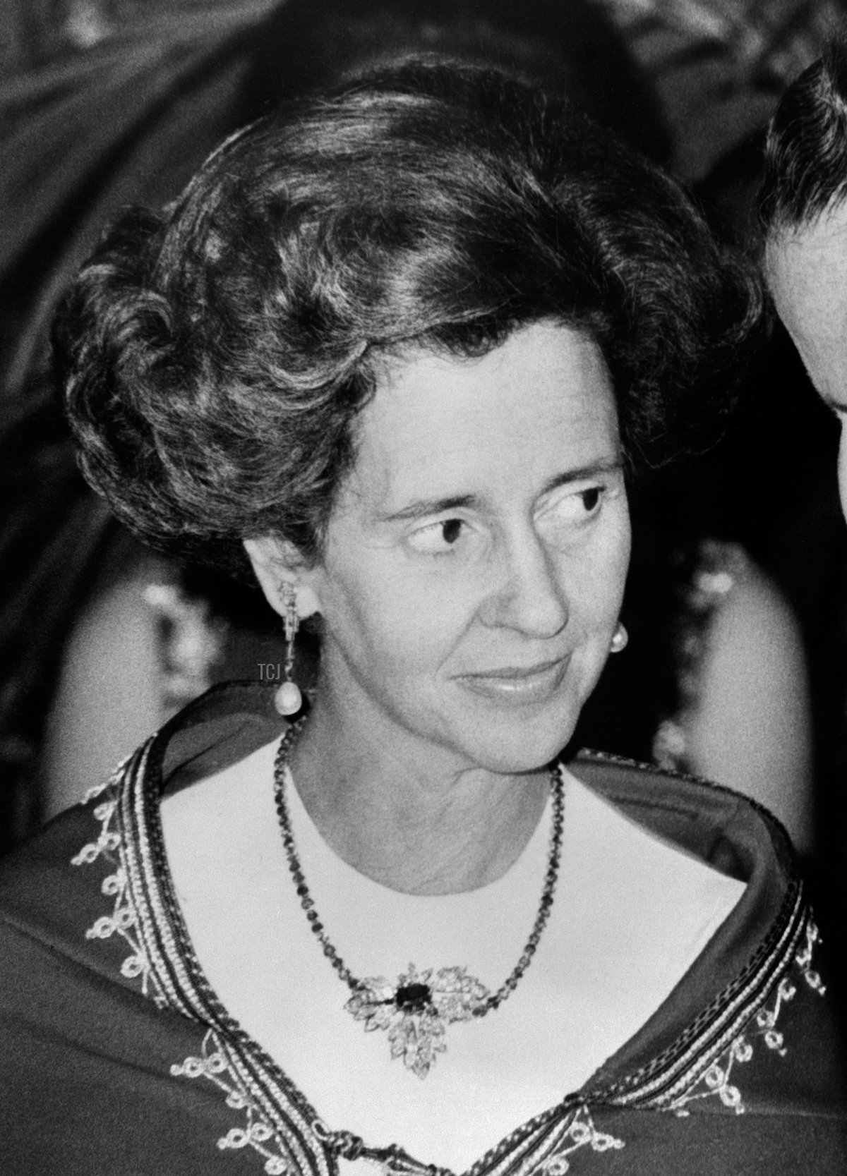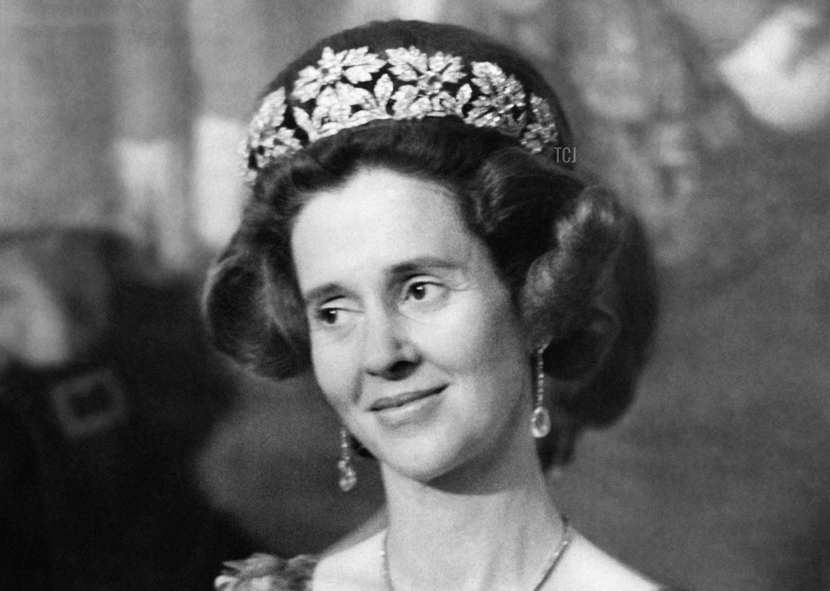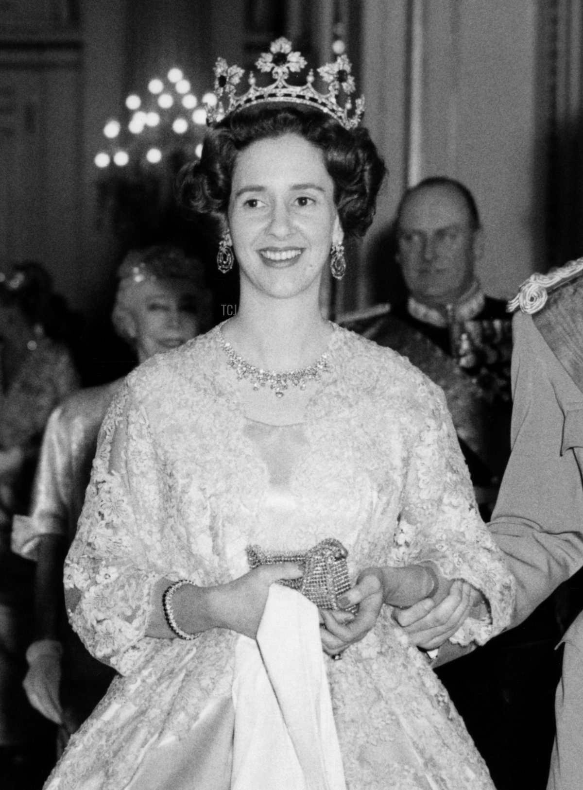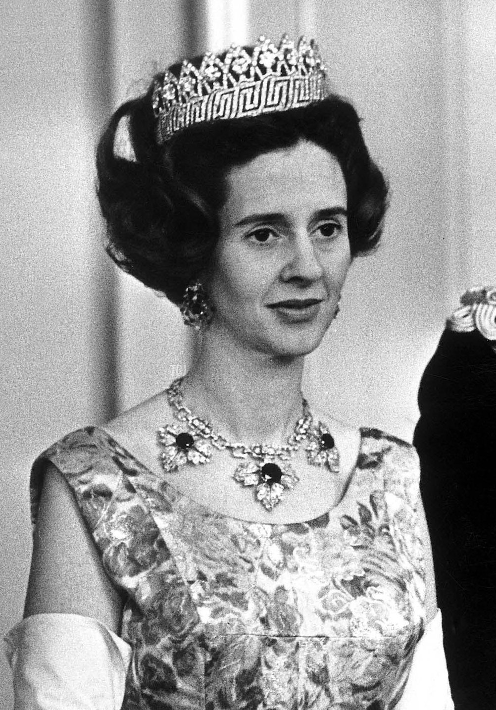 For this gala event in August 1968, Fabiola wears the necklace setting of the tiara, plus the Nine Provinces Tiara and her diamond circle earrings.