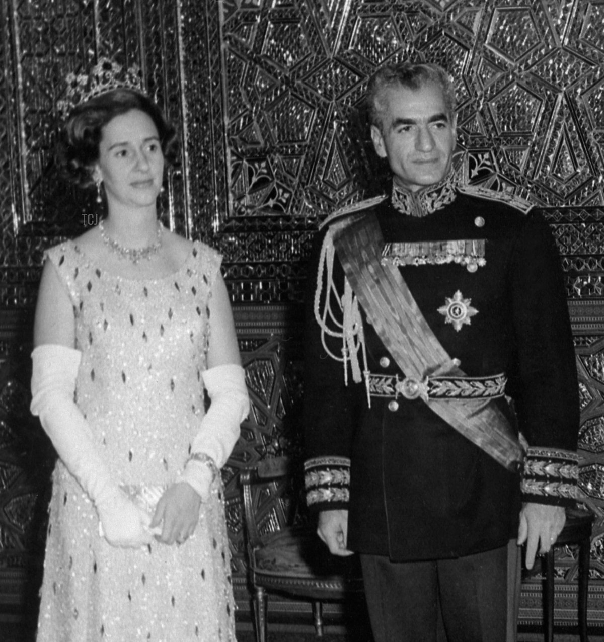 Fabiola also wore the coronet setting of the tiara in November 1964 for a formal event during the Belgian state visit to Iran. This photo of Fabiola with the Shah of Iran was taken at the Marble Palace in Tehran. She also wears the Wolfers Tiara as a necklace and her diamond and pearl drop earrings, plus a diamond bracelet on her left wrist.