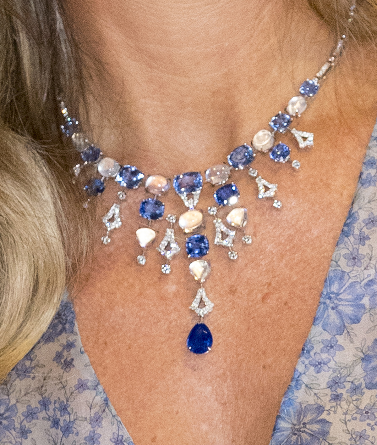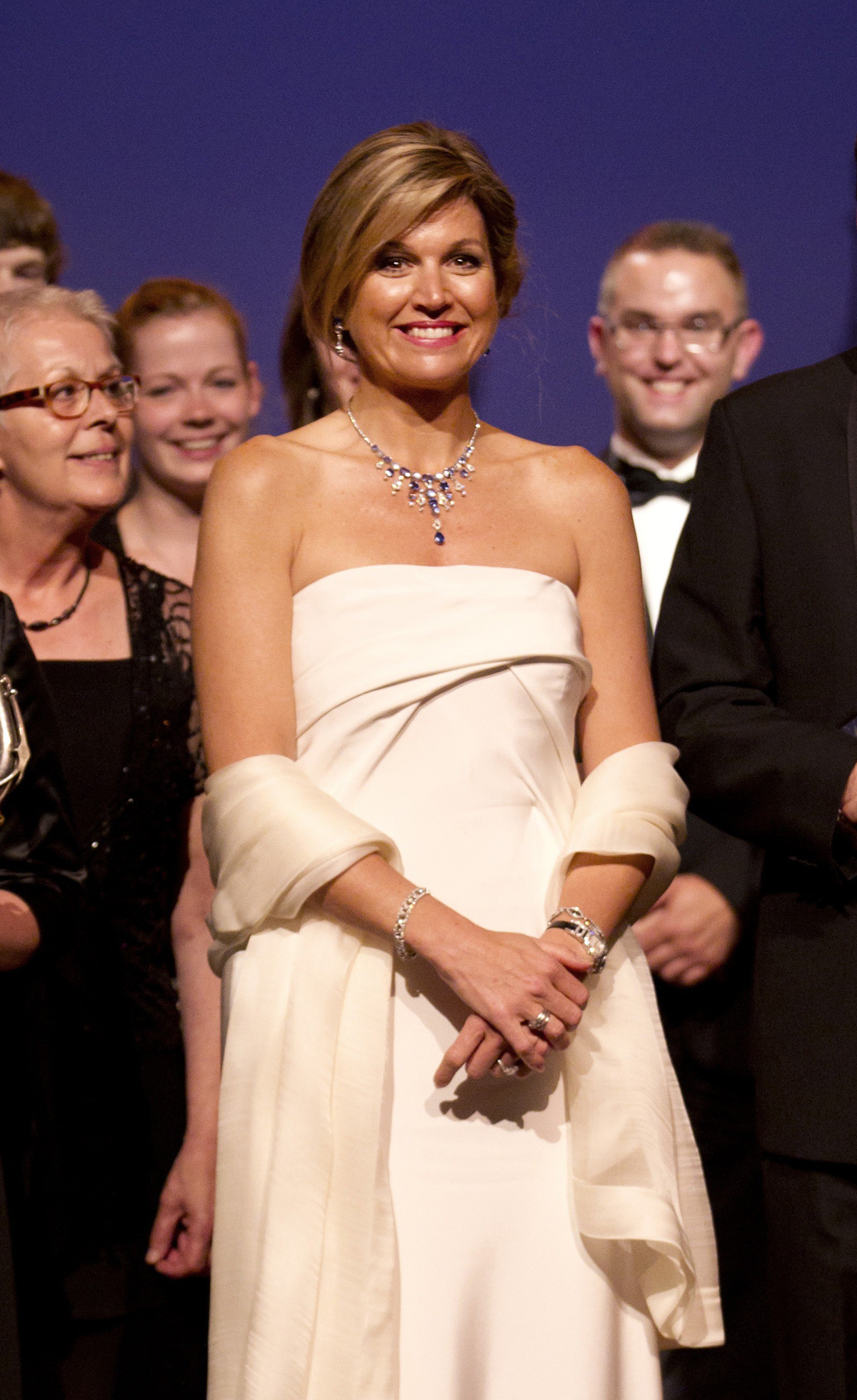 The set includes a necklace and matching earrings, and Maxima almost always wears them together, usually for evening events that are less formal than occasions that call for tiaras.
