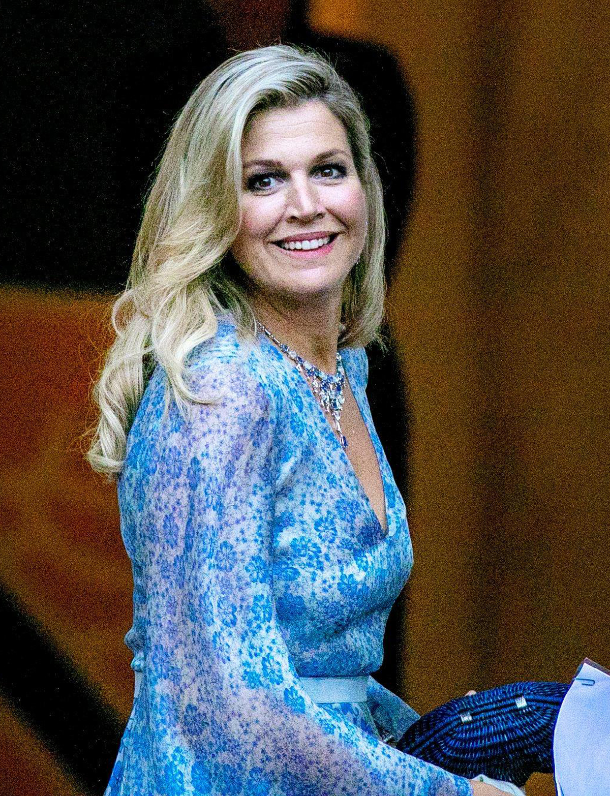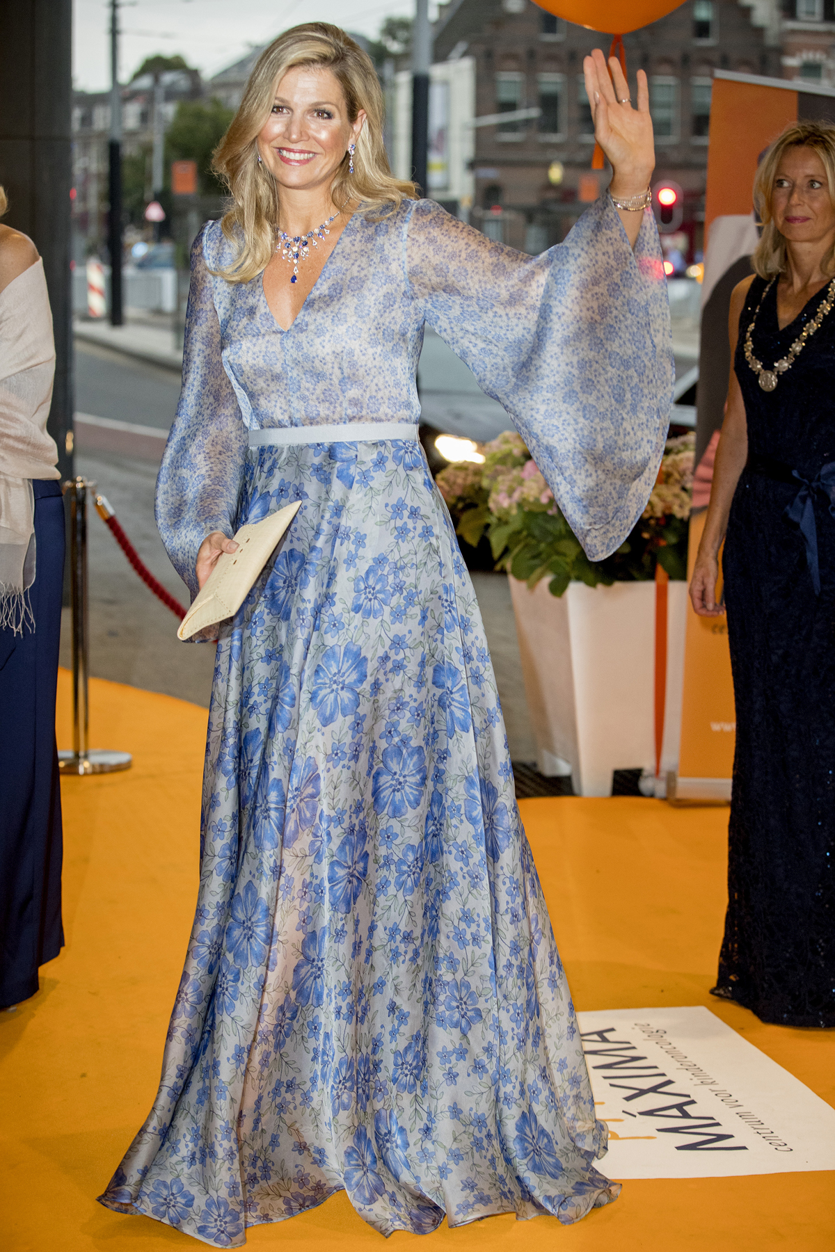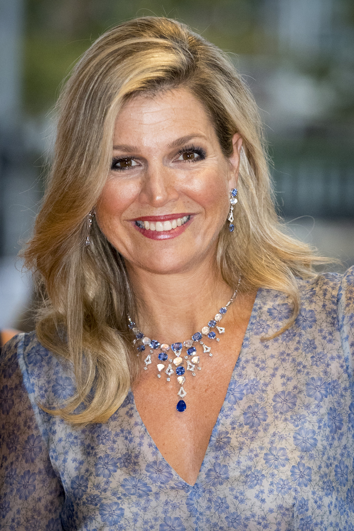 Queen Maxima echoed the blue of the gemstones with her floral gown in September 2017, when she wore the suite for a special gala dinner in Amsterdam benefitting the Princess Maxima Center for Children’s Oncology.
