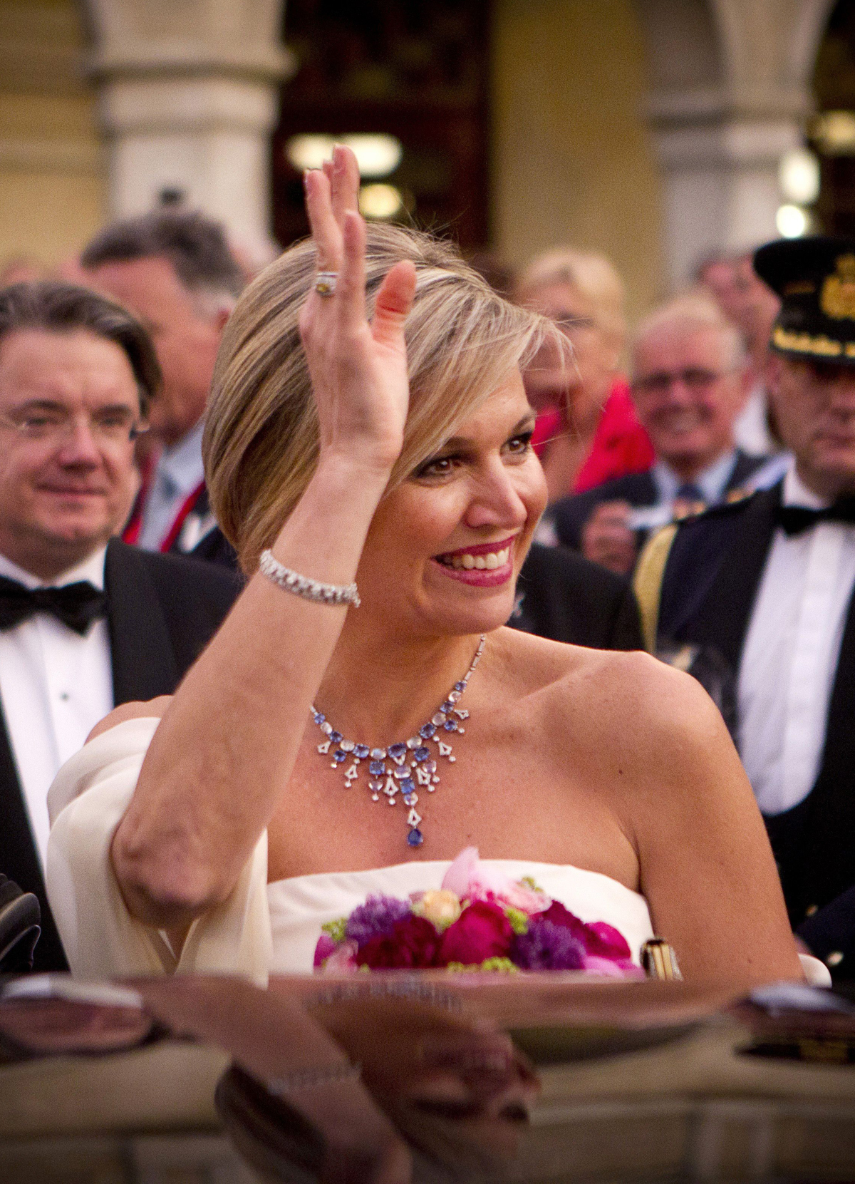 She paired the necklace and earrings with two of her favorite diamond bracelets (her wedding bracelet and her family initial bracelet) in May 2014 for a special concert in Kaatsheuvel, celebrating the 150th anniversary of the Koninklijke Sophia’s Vereeniging.