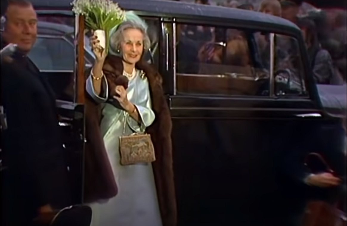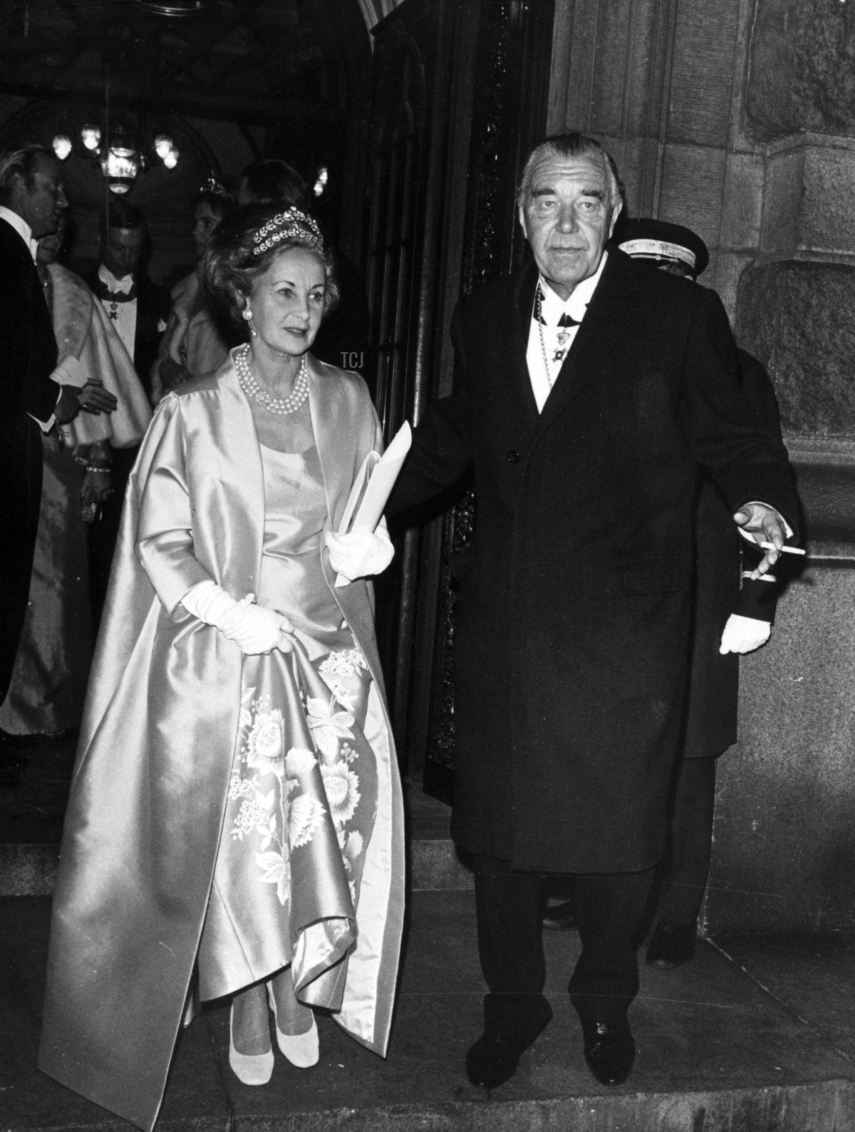 When their relationship no longer had to be hidden completely from Bertil’s father, Lilian moved to Sweden full time. But they remained careful to avoid the public gaze, avoiding appearances together in public until the late 1960s. Over time, King Gustaf VI Adolf softened toward the couple. In 1972, Lilian was even invited to the king’s 90th birthday celebrations, and during the festivities (pictured above), she wore a tiara in public for the first time: the Boucheron Laurel Wreath Tiara, which Bertil had inherited from his late mother.