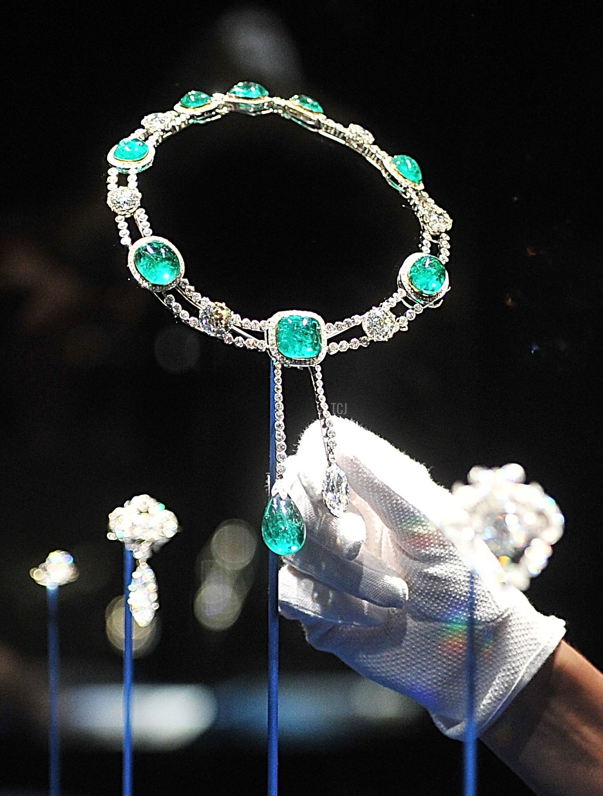Here’s a closer look at the Delhi Durbar Necklace, one of the parure’s most interesting pieces. The jewel is designed as a modern necklace with alternating diamonds and eight of the Cambridge emeralds, as well as a pair of négligée pendants. In jewelry terms, a “négligée” is an ornament with two pendant sections, one of which is slightly longer, producing an asymmetrical effect. The design was particularly popular during the Edwardian era, and the Durbar necklace was made at the very end of that period. One of the pendants is a cabochon emerald drop from the Cambridge emerald collection; the other is the 8.8-carat Cullinan VII Diamond.