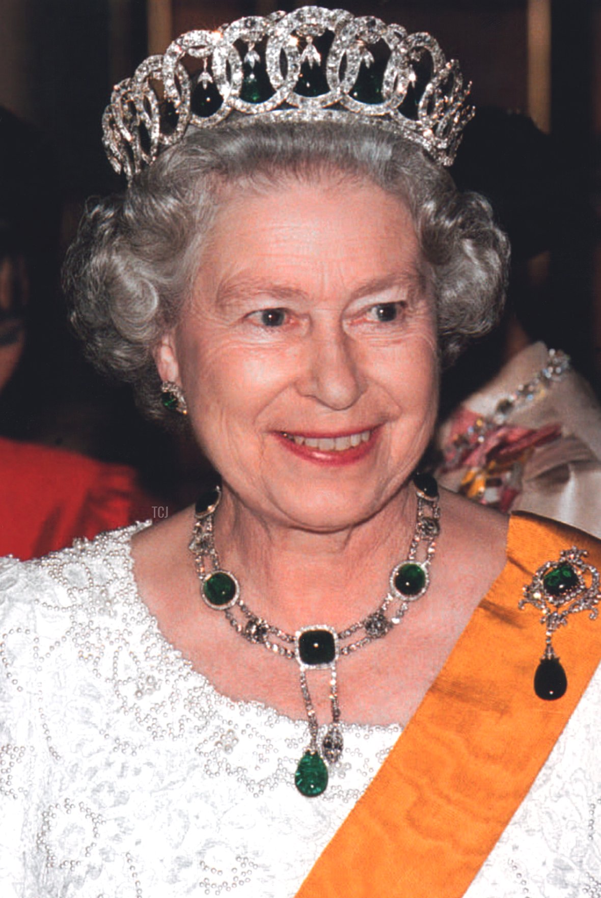 The Queen generally uses the emerald setting of the Vladimir Tiara with other pieces from the Delhi Durbar Parure. Here, during a visit to Thailand in 1996, she wears the Vladimir Tiara with the Delhi Durbar Earrings, the Delhi Durbar Necklace, and the Delhi Durbar Scroll Brooch. She also on occasion wears the Ladies of India Brooch and the Delhi Durbar Bracelet.