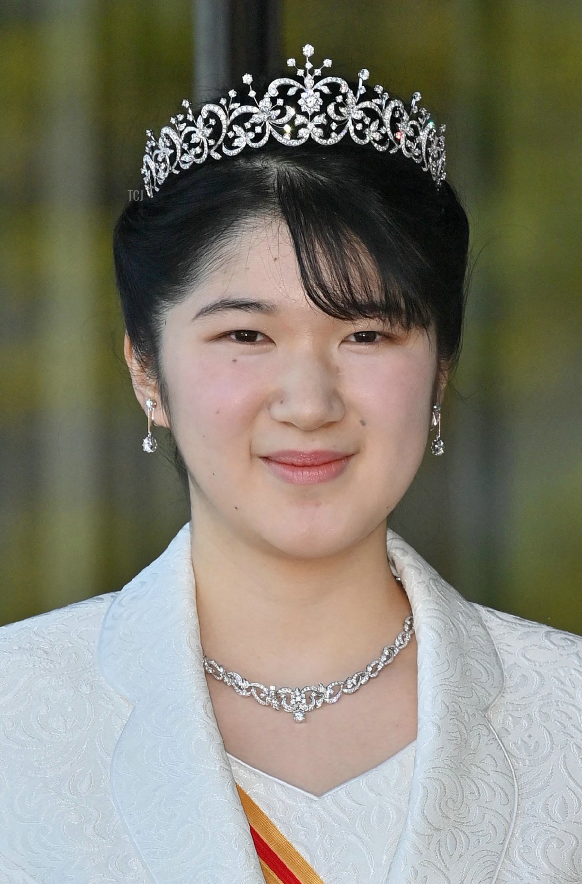 Empress Masako and Emperor Naruhito joined their daughter at the Imperial Palace in Tokyo on Sunday as she received official congratulations from government officials and family members. Masako wore pearls with a gold ribbon brooch for the occasion.