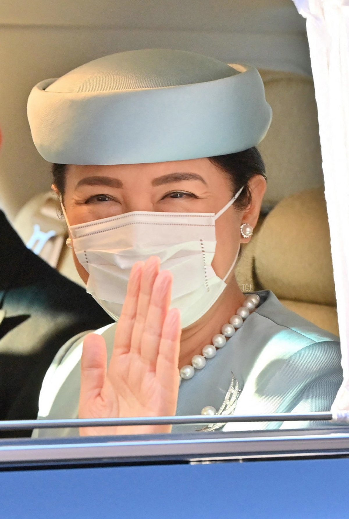 On Thursday, Empress Masako wore pearl cluster earrings, a pearl necklace, and a modern pearl and diamond brooch for a birthday visit with her parents-in-law, the Emperor and Empress Emeritus, at their home in Tokyo.