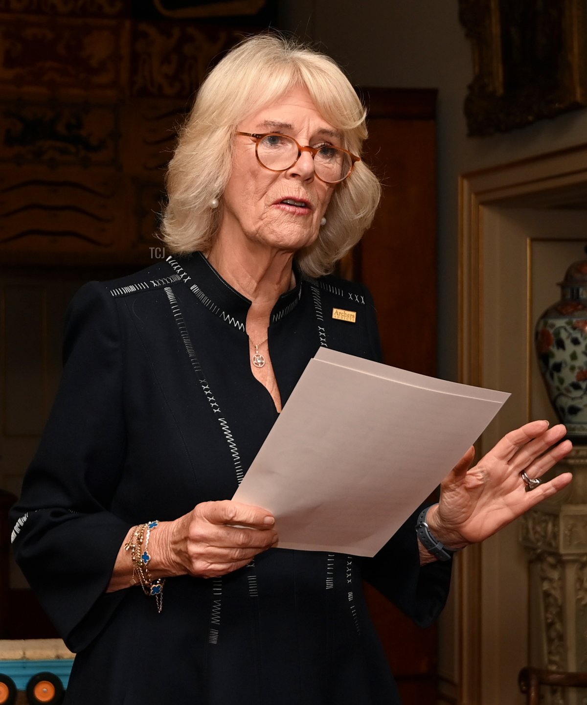 For a celebration of the 70th anniversary of the BBC radio drama The Archers at Clarence House on Tuesday, the Duchess of Cornwall wore her favorite diamond and pearl drop earrings, her Kiki McDonough Apollo Necklace, and several stacked bracelets, including her new Van Cleef & Arpels Magic Alhambra bracelet. She also fastened an “Archers Addict” fan club pin to her jacket.