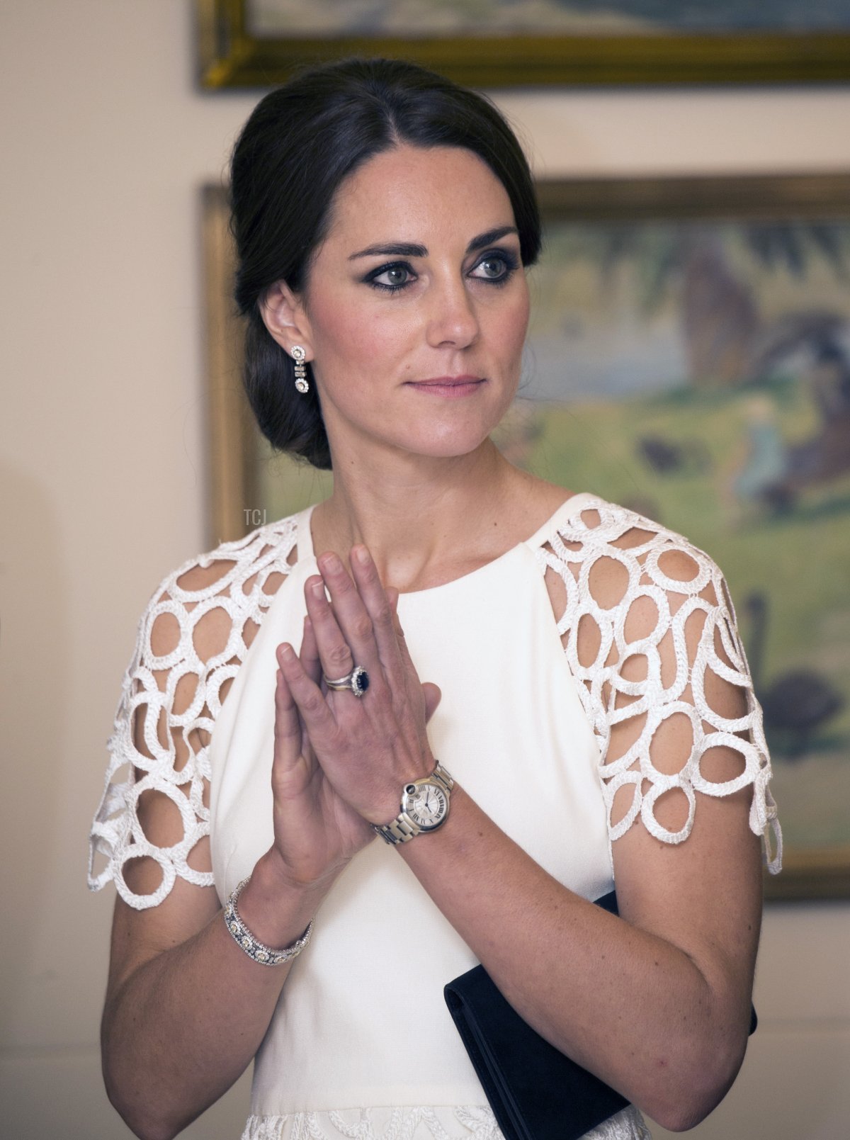 Diamond earrings, a bracelet, and a ring in a distinctive cluster-and-baguette design make up this versatile set, which is sometimes said to have been a wedding gift from Prince Charles. Kate wears the earrings and bracelet from the set above at Government House in Canberra during the tour of Australia in April 2014.