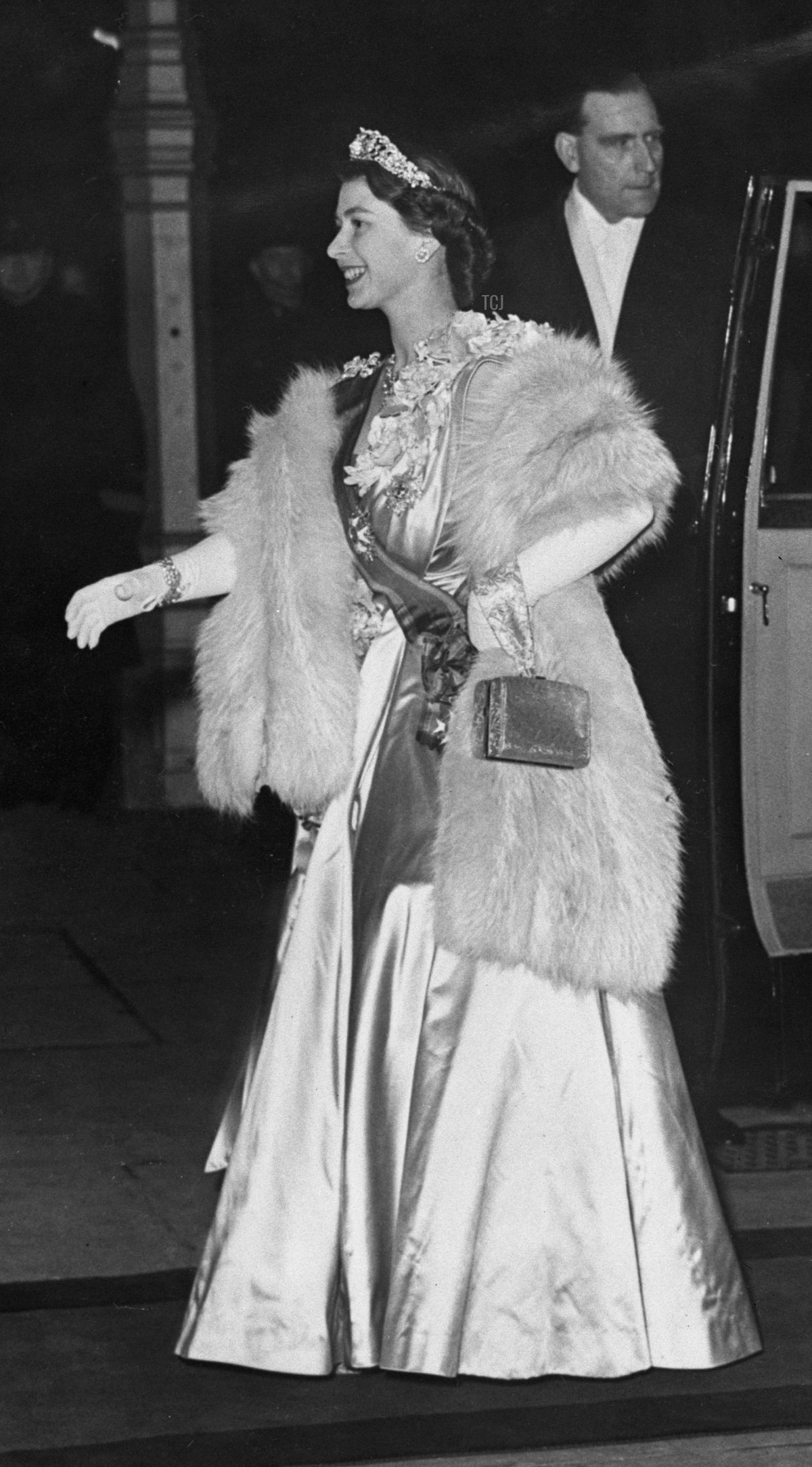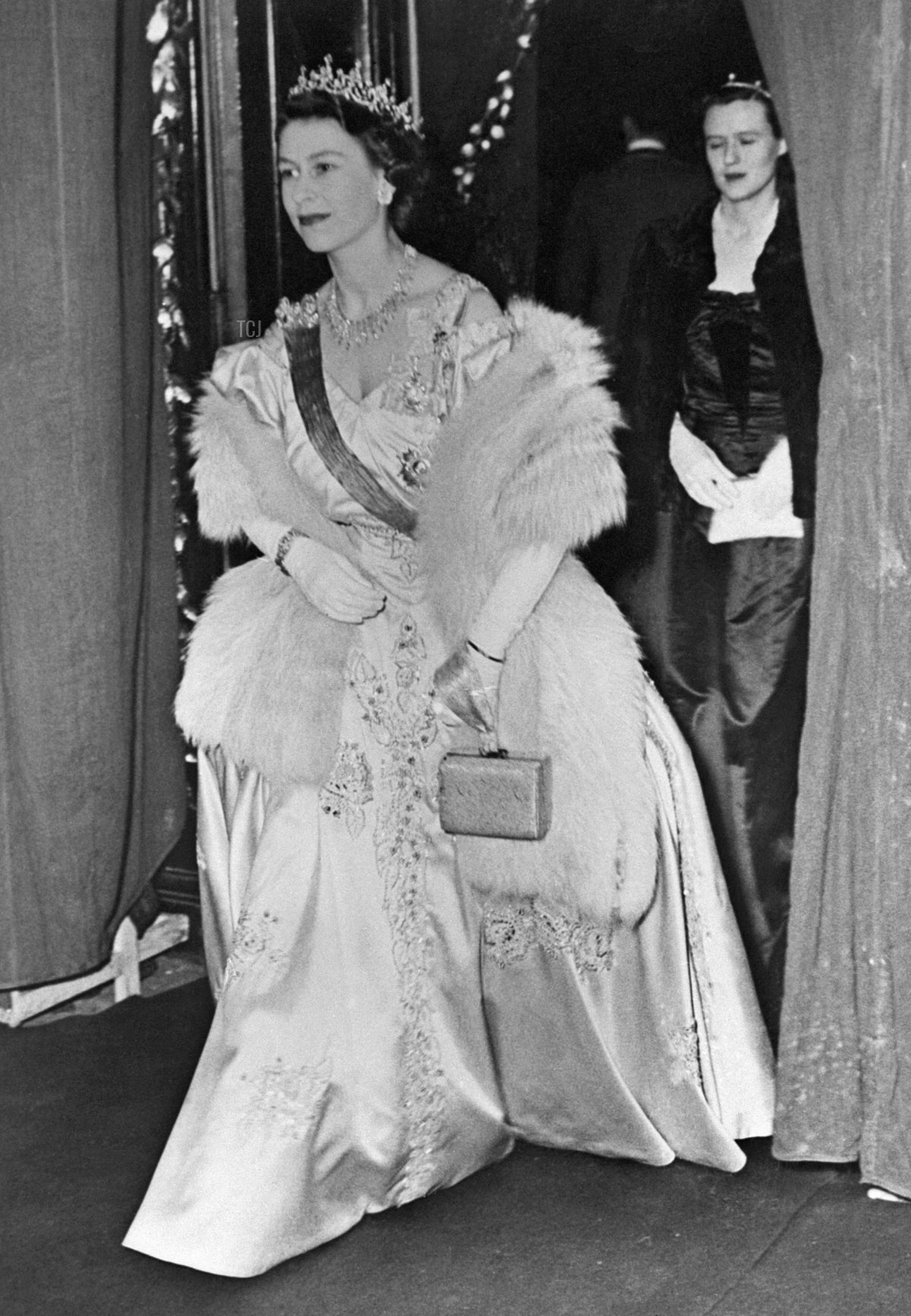 The tour of Canada ultimately went ahead, though it was delayed. The Edinburghs flew to Canada rather than sailing to help make up time. They arrived in Canada on October 8 and toured the entire nation. For a banquet held on October 9 in the ballroom at the Chateau Frontenac in Quebec City, Elizabeth wore a gown of silver lace and tulle. With the dress, she wore the Girls of Great Britain and Ireland Tiara and the Bahrain Pearl Drop Earrings. You’ll also spot the George VI Sapphire Necklace, before the renovation that made it shorter, peeking out from beneath her wrap. The necklace was a wedding gift from her father.