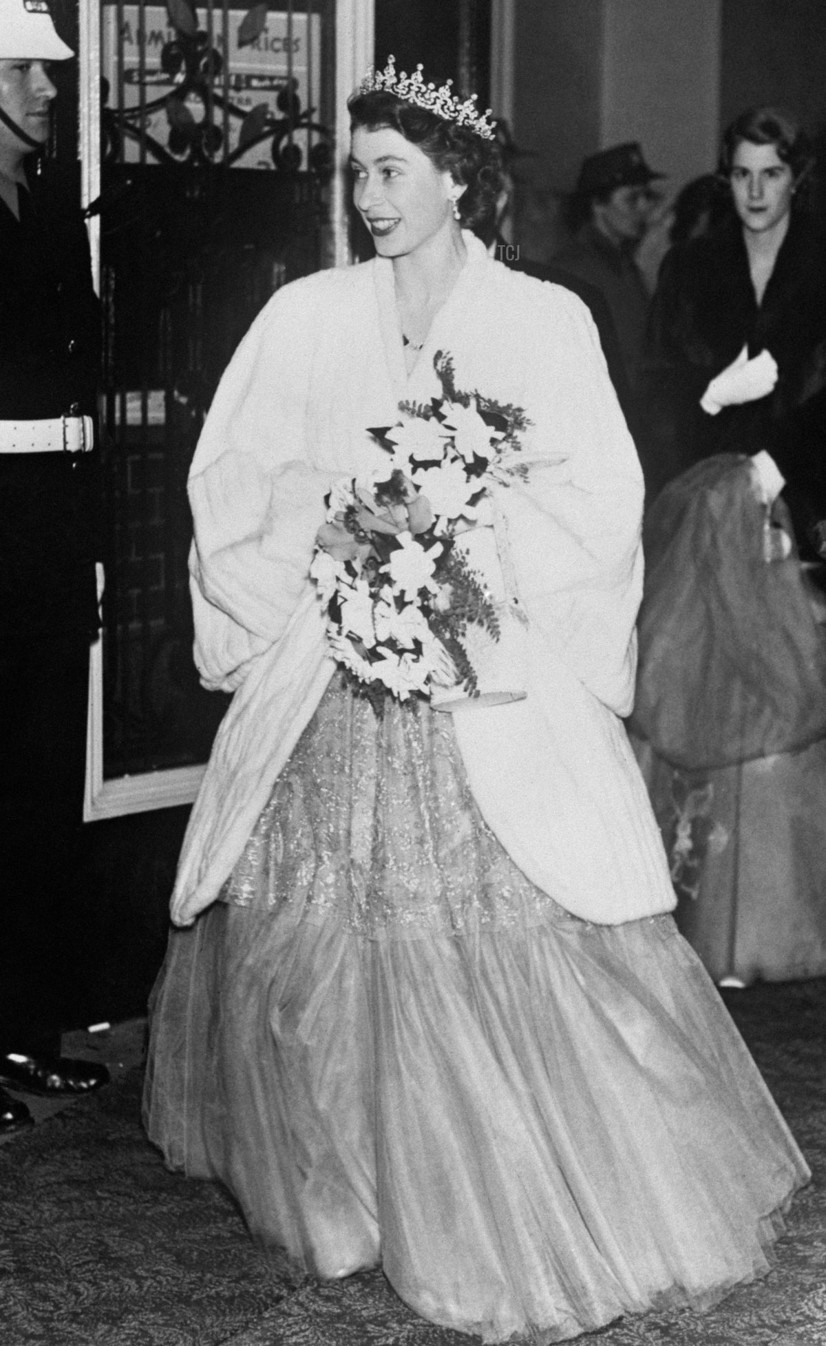On March 22, 1950, Princess Elizabeth was at the Guildhall in London to help launch the National Thanksgiving Fund. Prime Minister Clement Atlee and Winston Churchill, the Leader of the Opposition, were both in attendance, as was the Archbishop of Canterbury. Elizabeth wore the Girls of Great Britain and Ireland Tiara, the Diplomatic Corps Floral Earrings, the Nizam of Hyderabad Necklace, and the Edinburgh Wedding Bracelet.