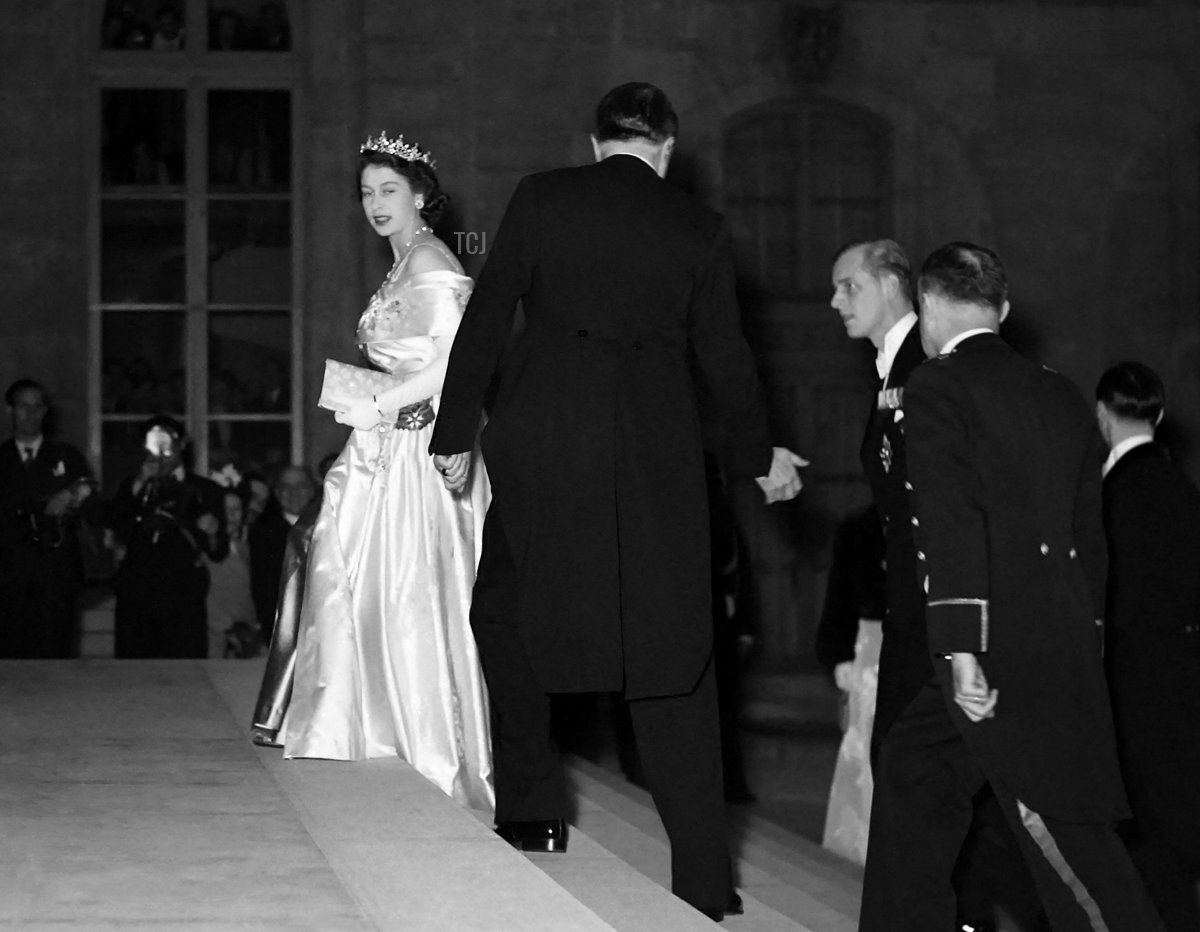 Elizabeth and Philip made their first trip abroad as a married couple in May 1948, when they embarked on an official visit to Paris. It was Princess Elizabeth’s first time traveling outside the Commonwealth. The four-day visit included several several gala events, made all the more challenging by the fact that the princess was expecting Prince Charles and was attempting to hide her early pregnancy from the press. On May 14, 1948, the Edinburghs arrived at the Elysee Palace in Paris for a dinner.