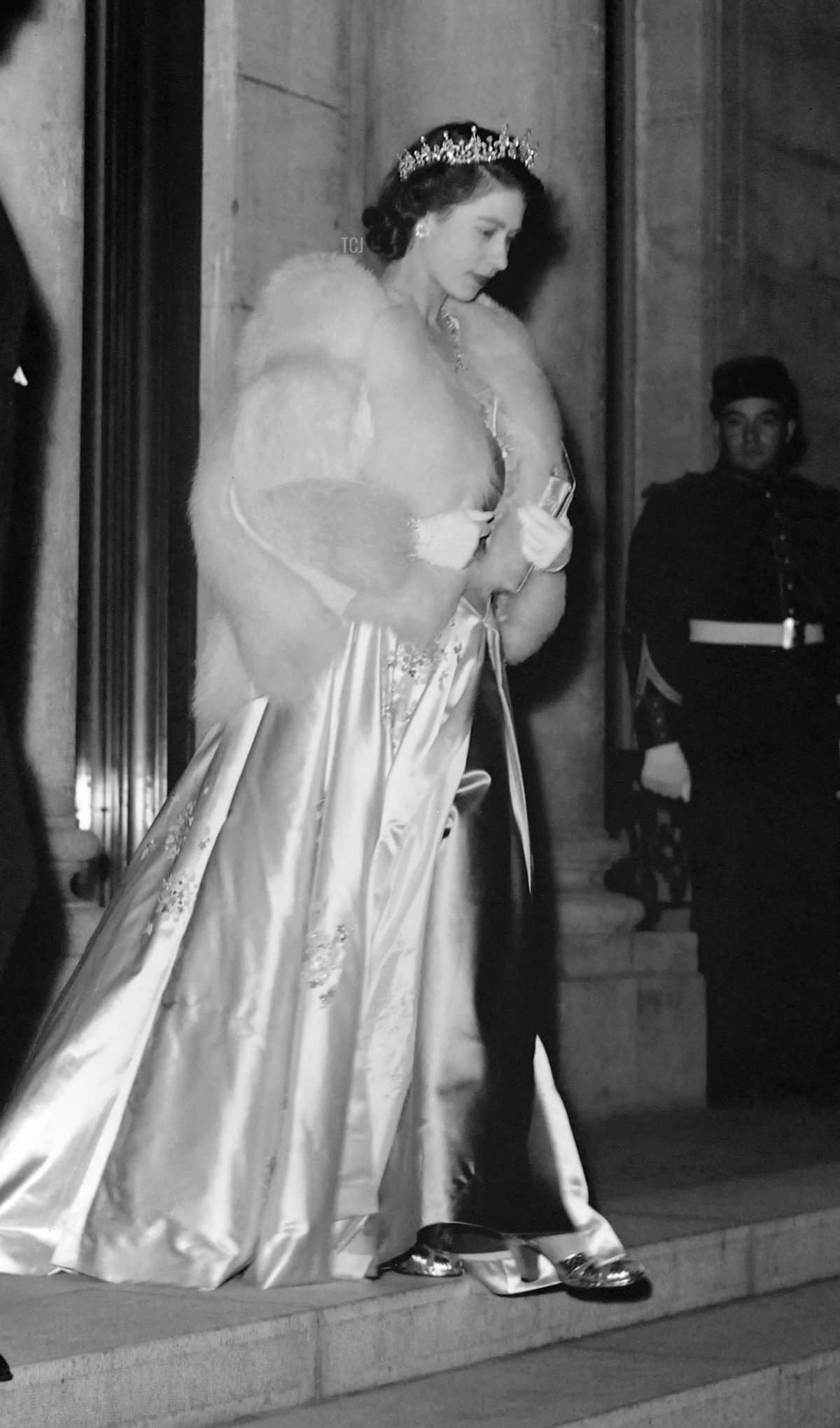 Here’s a photograph of Elizabeth leaving the Elysee Palace after the dinner. The image shows off the Girls of Great Britain and Ireland Tiara and the Diplomatic Corps Floral Earrings nicely.