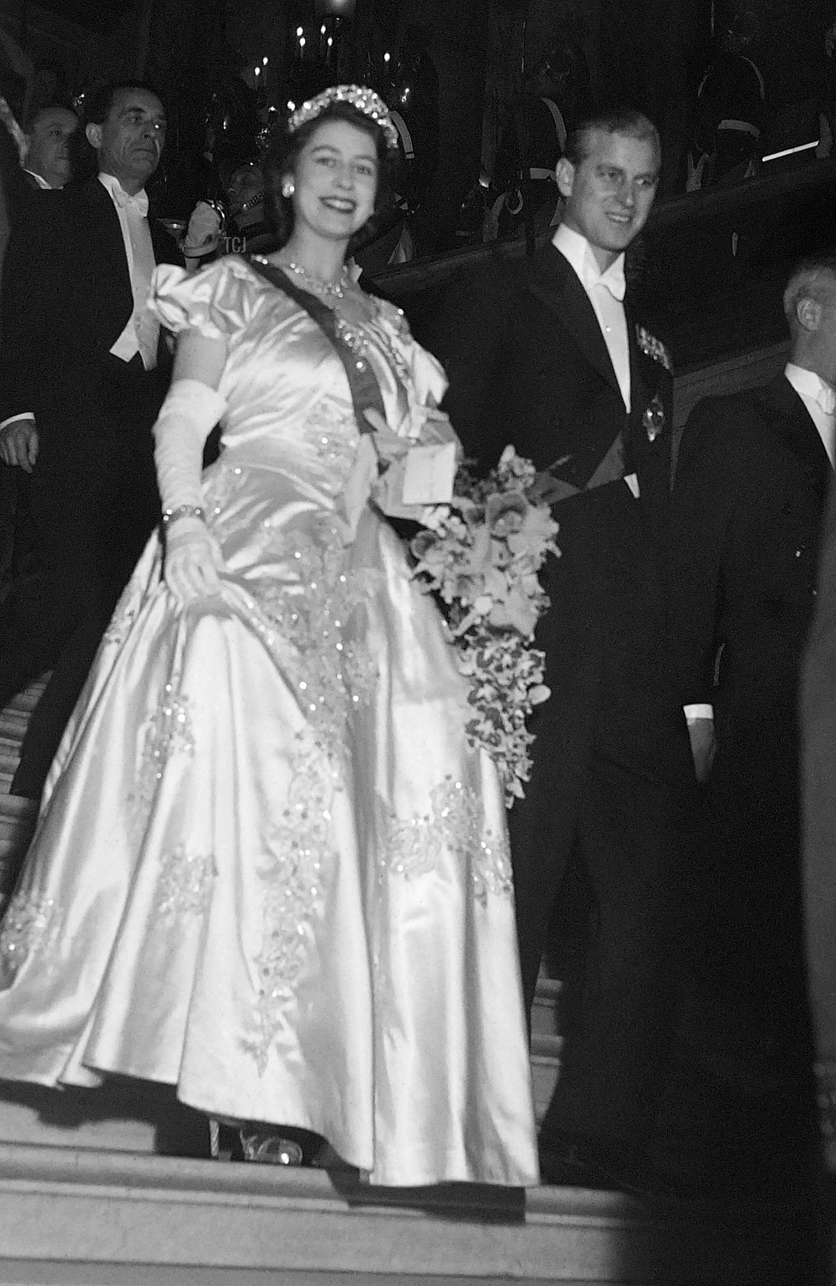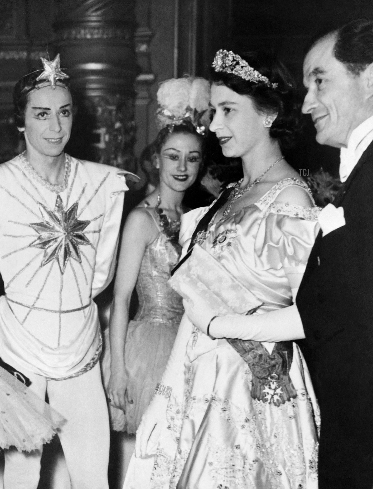 A few days later, on May 17, 1948, Elizabeth and Philip attended another glittering event in Paris. This time, they were the guests of honor at a gala performance at the Opera Garnier. For the event, Elizabeth wore the Nizam of Hyderabad Tiara with its coordinating necklace, plus the Diplomatic Corps Floral Earrings and the Edinburgh Wedding Bracelet.
