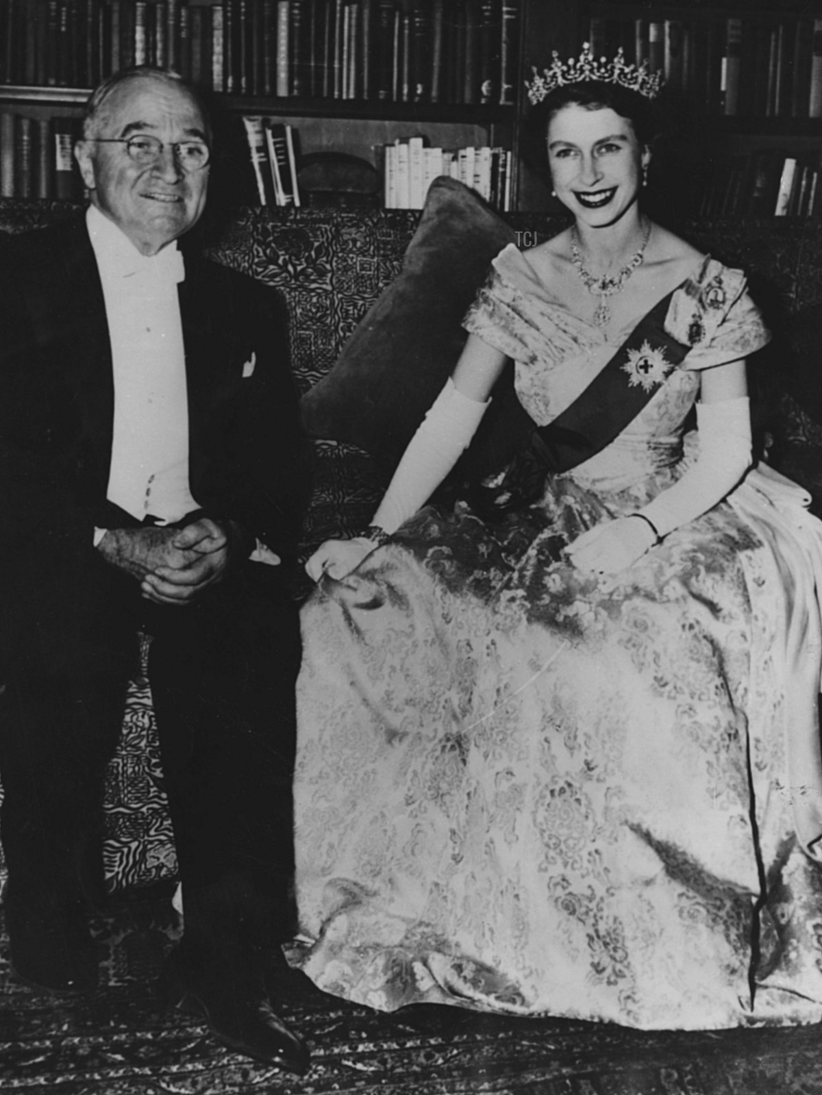 During the tour, the Edinburghs also made a quick detour to the United States, visiting President Harry Truman in Washington, D.C. The trip included two formal events. The second of these, pictured above, was held at the Canadian Embassy in Washington on November 1, 1951. The princess and the president posed together in the embassy library. Elizabeth wore a gown of turquoise and cream brocade, accessorized with the Girls of Great Britain and Ireland Tiara, the Bahrain Pearl Drop Earrings, the Nizam of Hyderabad Necklace, and the Edinburgh Wedding Bracelet.