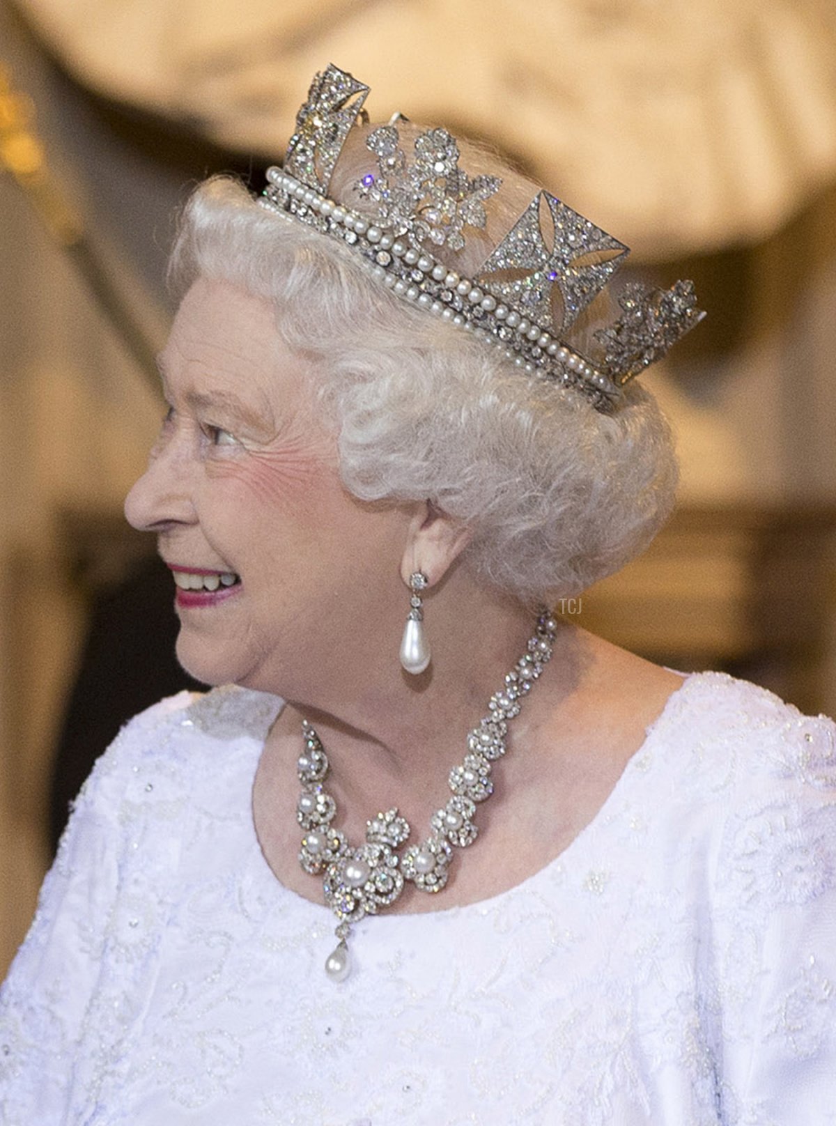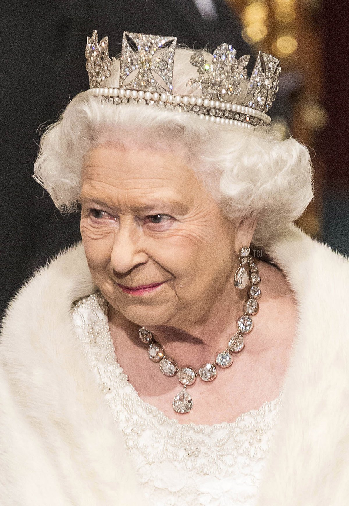 These classic earrings feature diamond studs with long pearl drops connected by another small diamond brilliant. They were a gift from Prince Albert to Queen Victoria in 1847. Here, the Queen wears them with the Diamond Diadem and the Golden Jubilee Necklace for the State Opening of Parliament in June 2014.