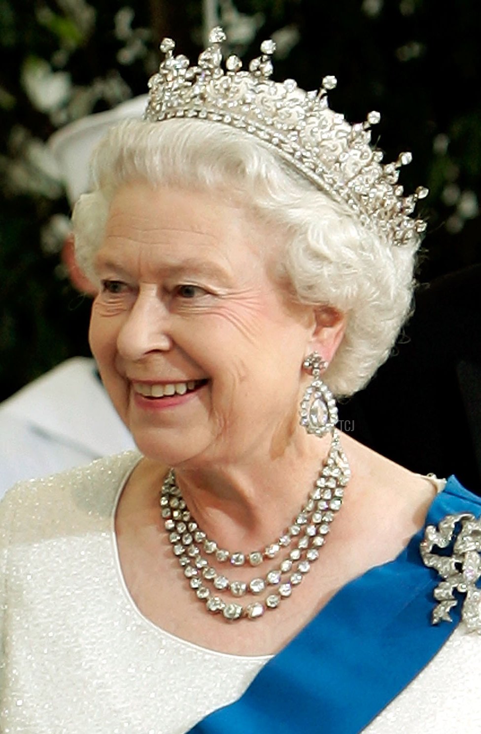 Queen Victoria designated three complete diamond collet necklaces (the Coronation Necklace, plus a 45-collet necklace and a 42-collet necklace) as heirlooms of the crown, and she also left a collection of 154 spare diamond collets. These were used later, especially by Queen Mary, to adjust and lengthen other necklaces. In 1950, King George VI had 105 of the collets used to make a new diamond festoon necklace. The Queen inherited its exclusive use in 1952, and she’s worn it regularly for the past seven decades. Here, the Queen wears the necklace for a state dinner in Washington, D.C., in May 2007, paired with the Girls of Great Britain and Ireland Tiara, Queen Mary’s Diamond Frame Earrings, and Queen Mary’s Lover’s Knot Brooch.