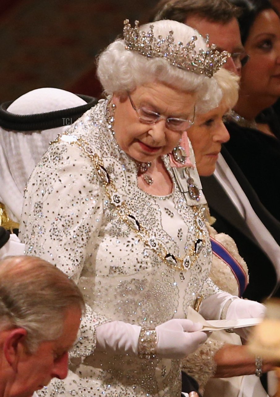 The first item on Menkes’s list is this jewel: the diamond and pearl diadem made in 1820 by Rundell, Bridge, and Rundell. It was made for the coronation of King George IV, but since then it has been worn exclusively by queens regnant and consort. Elizabeth donned it in public for the first time in November 1952 at her first State Opening of Parliament as monarch, and she’s worn it regularly for the event ever since. In the early years of her reign, she also occasionally used the diadem for other gala occasions. Here, the Queen wears the diadem for the State Opening of Parliament in December 2008, paired with the Gloucester Pendant Earrings.