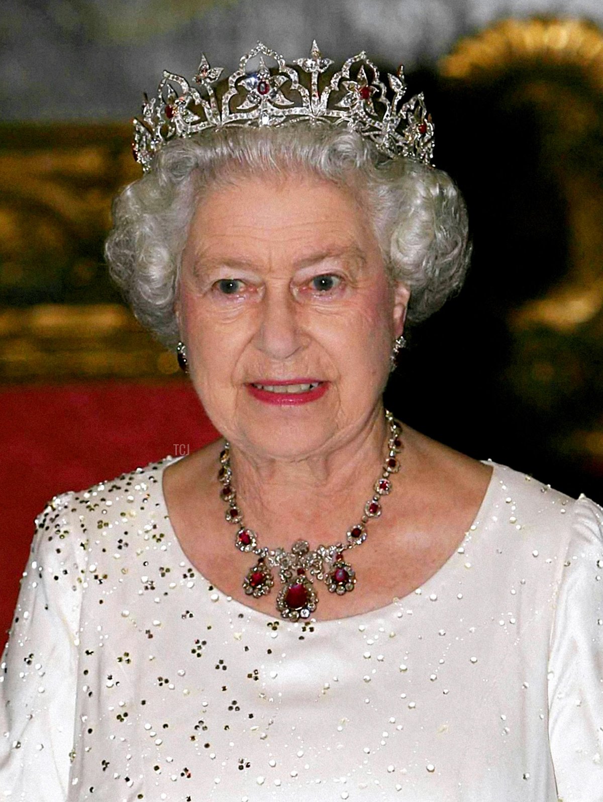 Inspired by Indian motifs he viewed at the Great Exhibition, Prince Albert designed this diamond circlet for Queen Victoria in 1853. The piece was originally studded with opals. When the British lost the Hanoverian claim, the circlet had to be remade with new diamonds. In the early 20th century, the entire suite was renovated again when Queen Alexandra and Queen Mary had the opals replaced with rubies. The Queen Mother absolutely loved the tiara, and she retained it even after her daughter became Queen in 1952. The present Queen added it to her collection on her mother’s death in 2002. Here, the Queen wears the circlet with Queen Mary’s Ruby Cluster Earrings and the Baring Ruby Necklace for a banquet in Malta in November 2005.