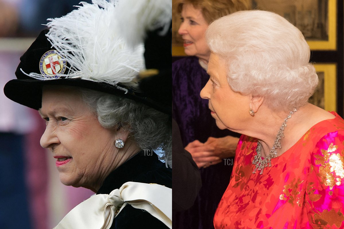Both Queen Victoria and Queen Mary owned diamond solitaire stud earrings with collet settings (meaning that a collar of metal hugs the outside of the stone). Menkes states that Victoria’s are “two diamond collets taken from a collet necklace.” Mary’s pair, says Hugh Roberts, were made using two collets taken from the Coronation Necklace. Both pairs are heirlooms of the crown, and telling the difference between them is (if you ask me) mostly a losing game. Above, the Queen wears diamond solitaire earrings with collet settings on two different occasions. I won’t guess which pair is which. On the left, the Queen is pictured wearing collet earrings at the annual Garter Day ceremony in June 2005, and on the right, she’s photographed wearing collet earrings with the King Khalid Necklace at a Diamond Jubilee dinner for the Aga Khan at Windsor Castle in March 2018.