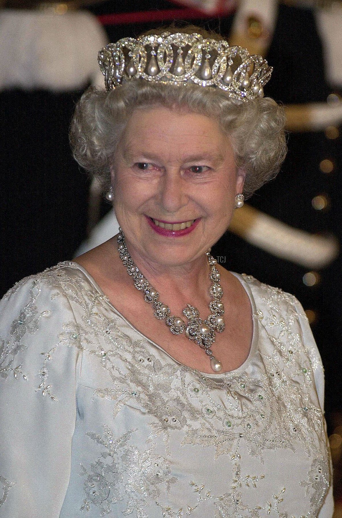 This elaborate diamond and pearl necklace was made by Carrington and Co. in 1888 to mark the 50th anniversary of Queen Victoria’s reign; it was commissioned in a very complicated, political process by a committee of aristocratic women. It became one of Victoria’s favorite pieces, so it’s no surprise that she designated it as an heirloom of the crown. The Queen wore it for her first opening of parliament in 1952, and it’s been a staple of her gala jewelry ever since. Here, the Queen wears the necklace with the pearl setting of the Vladimir Tiara and Queen Alexandra’s Wedding Earrings for a state banquet in Rome in October 2000.