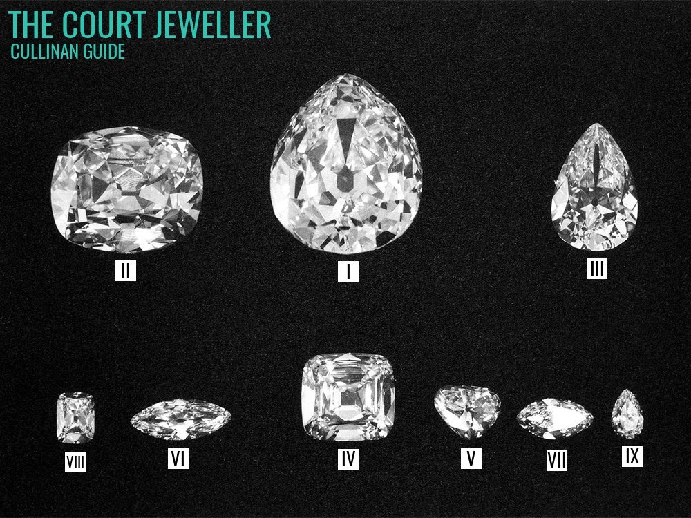 Here’s a look at the nine major diamonds cut from the original Cullinan stone. I’ve spiced up this old illustration of the diamond with some labels for you—you’re welcome! In the top row, you’ll see the three biggest diamonds. From left to right: the Cullinan II, the Cullinan I, and the Cullinan III. And on the bottom row are the six smaller stones: The Cullinan VIII, the Cullinan VI, the Cullinan IV, the Cullinan V, the Cullinan VII, and the Cullinan IX.