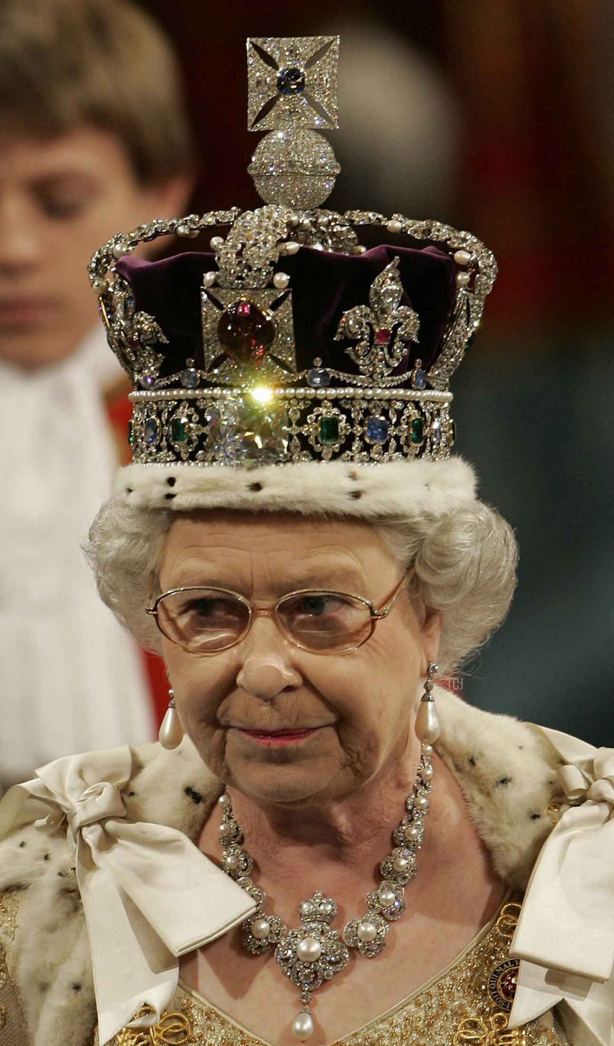 The Cullinan II, a 317.4-carat cushion-shaped diamond, is often called “the Second Star of Africa.” Like the Cullinan I, it’s part of the British crown jewels. The diamond is set in the front of the Imperial State Crown, below the Black Prince’s Ruby. Above, the Queen wears the crown (with Queen Victoria’s Pearl Drop Earrings and her Golden Jubilee Necklace) during the State Opening of Parliament in November 2004.