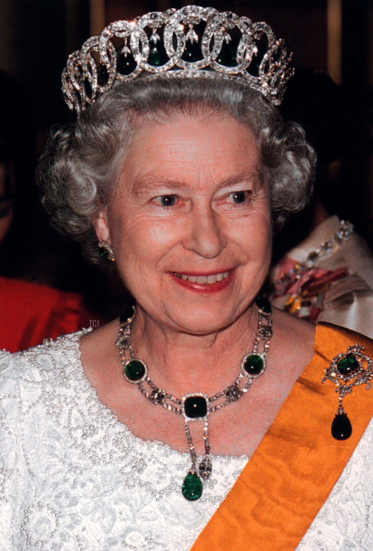 The Cullinan VII, an 8.8-carat marquise-cut diamond, is set in the lovely negligee-style necklace from the Delhi Durbar Parure. Here, the Queen wears the necklace (with the emerald setting of the Vladimir Tiara and the scroll brooch from the Delhi Durbar parure) for a state banquet in Bangkok in October 1996.