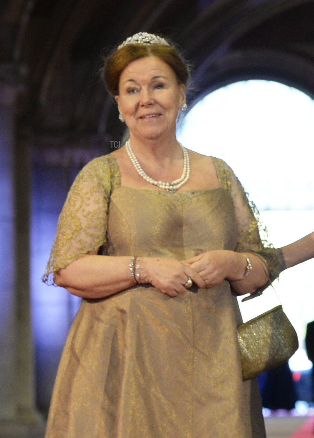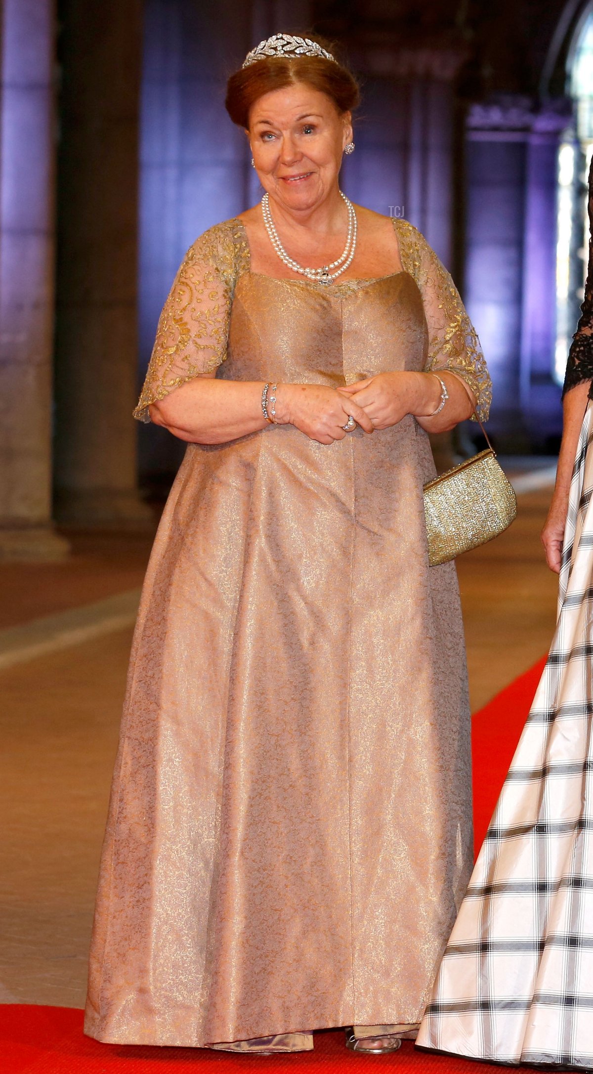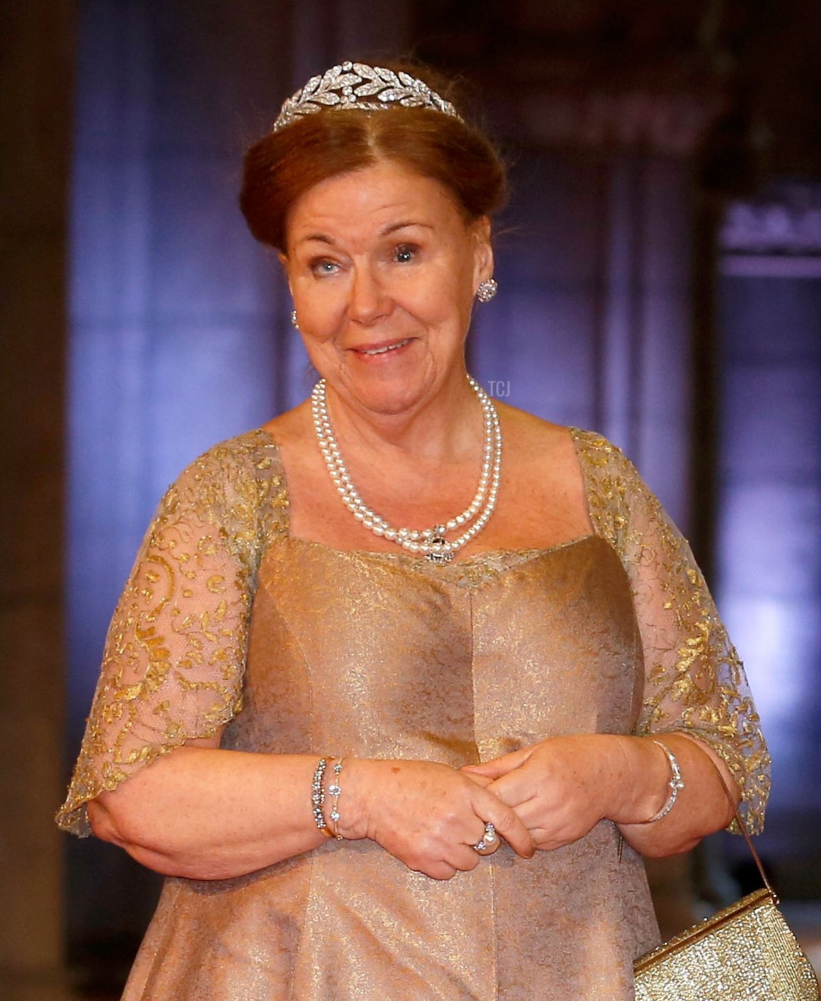 Princess Christina gleamed in a metallic gown in a coppery shade of gold, with gold lace sleeves and embellishments. She paired diamonds and pearls with the outfit.