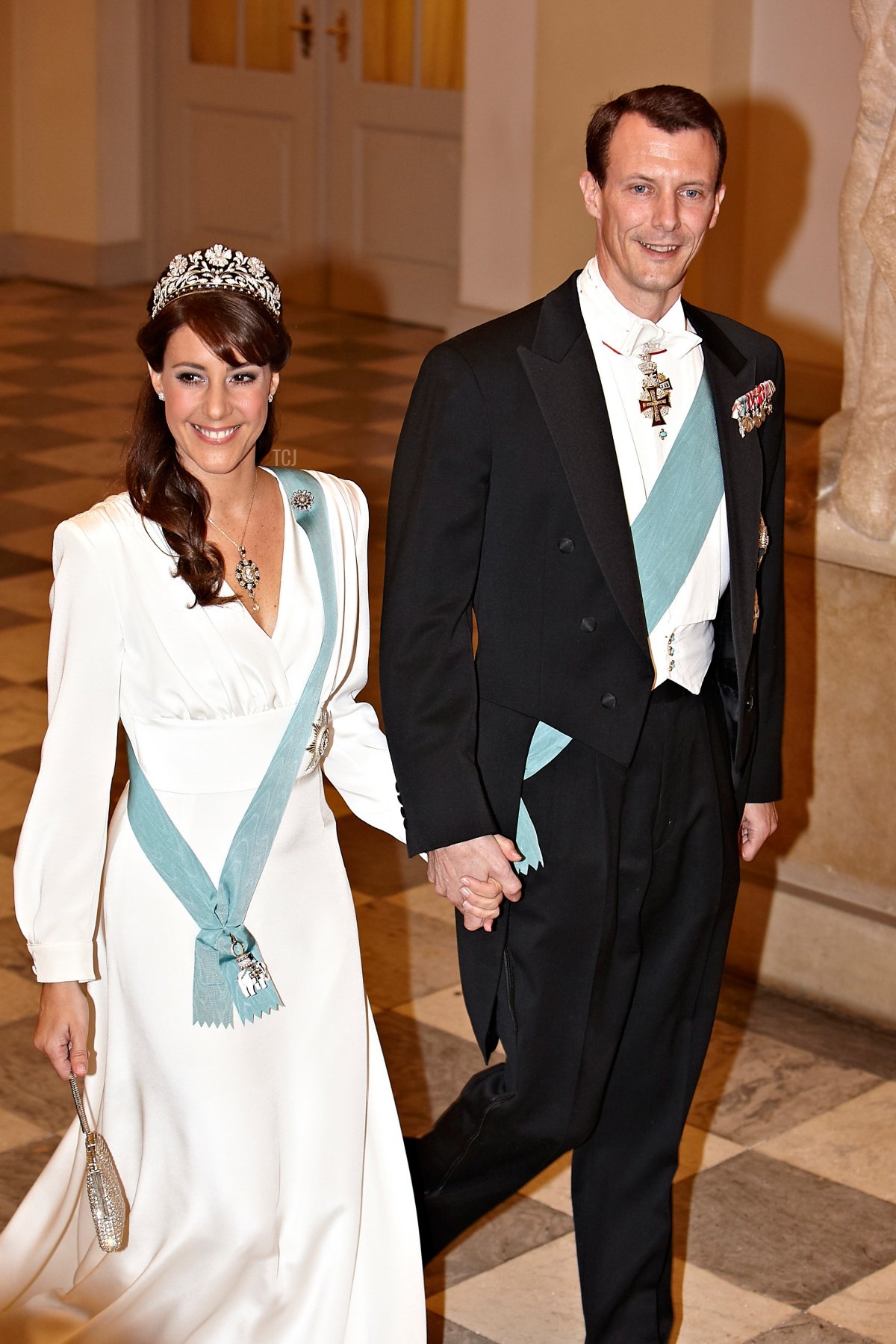 For the celebration, Princess Marie wore a classic white gown with a design inspired by vintage fashions from the 1930s and 1940s. She paired a silver handbag with the dress. She also wore her Danish royal decorations: the sash and star of the Order of the Elephant. Prince Joachim wore his medals with the Order of the Elephant, plus the insignia of the Order of the Dannebrog.