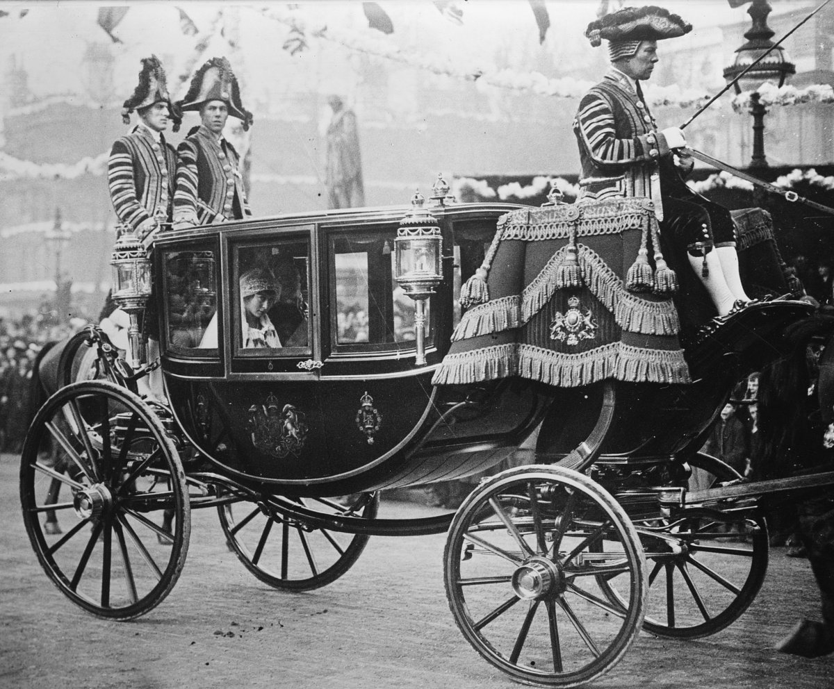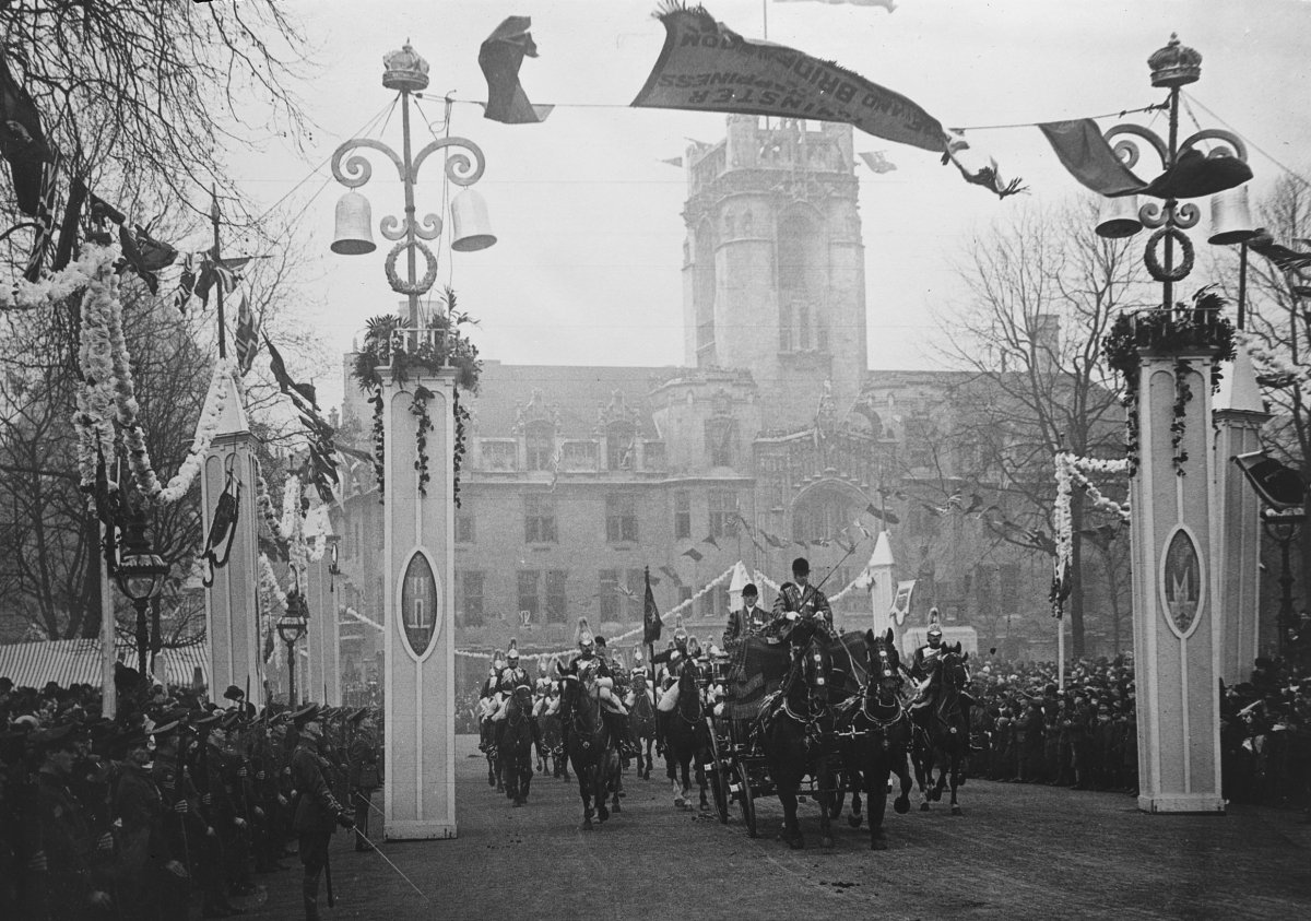 The date for the wedding was fixed soon after, and London planned for grand celebrations on February 28, 1922. This was one of the first big royal weddings after the war, and the city celebrated heartily. Decorations and banners went up in the city, with the couple’s initials, H and M, featured prominently, as on the columns above. Crowds gathered thickly along the procession route to cheer the princess and her father as they rode to Westminster Abbey for the ceremony, and the bride and groom as they headed to Paddington Station after the wedding.