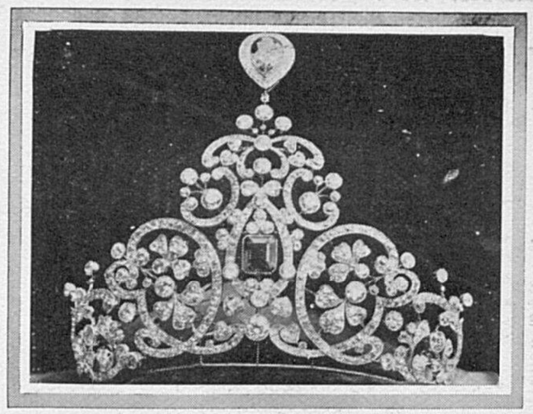 And, in recognition of her wartime service with their organization, 50,000 members of the Voluntary Aid Detachment presented this diamond and emerald tiara to the princess. I haven’t seen a photograph of Mary wearing this tiara. Made by Hunt & Roskell, the jewel was versatile. The side sections of the tiara could be detached, and the central portion flipped over for use as a brooch.