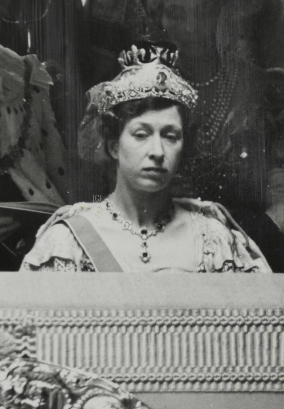 Here, the newly married couple poses for an official portrait with the bride’s parents, Queen Mary and King George. Queen Mary’s jewels include the Cullinan III and IV Brooch (now worn by Queen Elizabeth II) and the Diamond and Pearl Lattice Choker Necklace (now worn by Princess Anne), as well as additional diamond necklaces. She’s also wearing the jeweled garter from the Order of the Garter Insignia on her left arm.