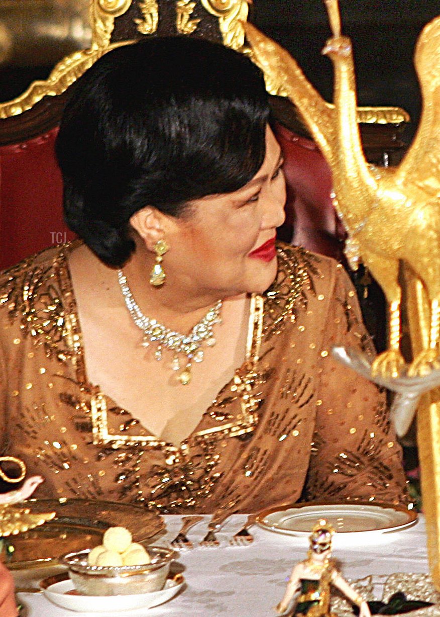 Queen Sirikit accessorized her golden gown with major jewels, including a necklace, earrings, and a bracelet.