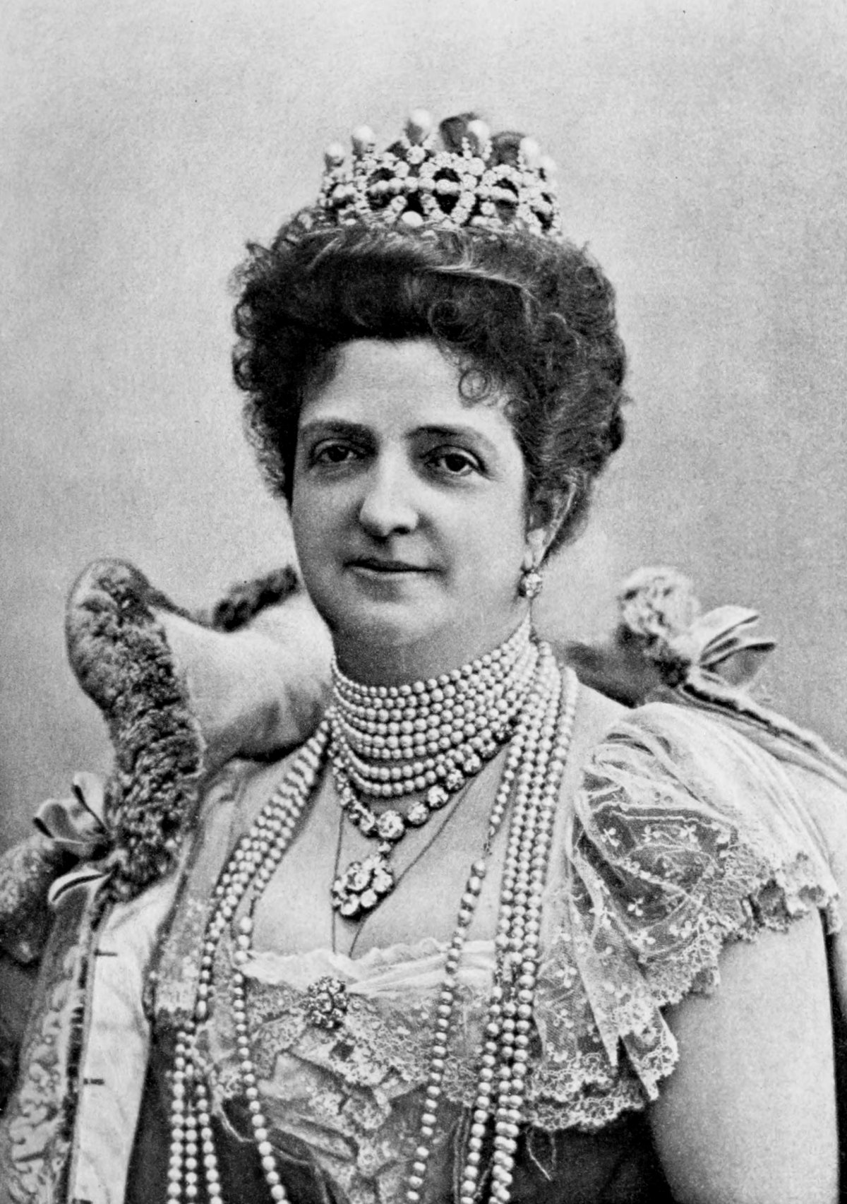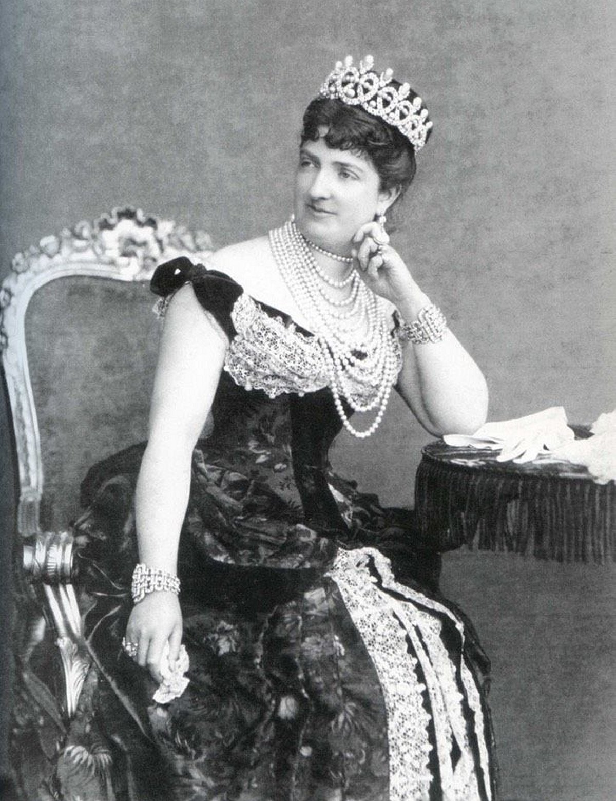 Probably the most recognizable jewel from the collection is Queen Margherita’s Savoy Knot Tiara, made of diamonds and pearls and featuring the heraldic Savoy knot motif in its design. Here, Queen Margherita wears the tiara in a photographic portrait, along with additional diamonds and her famous pearls (which were not part of the collection).