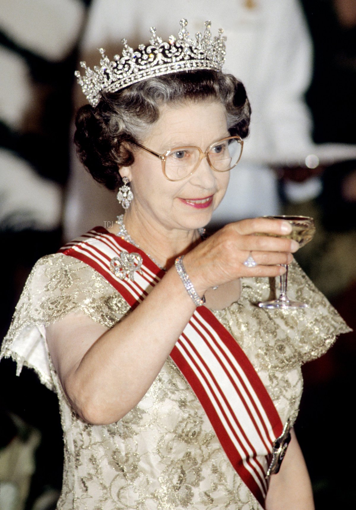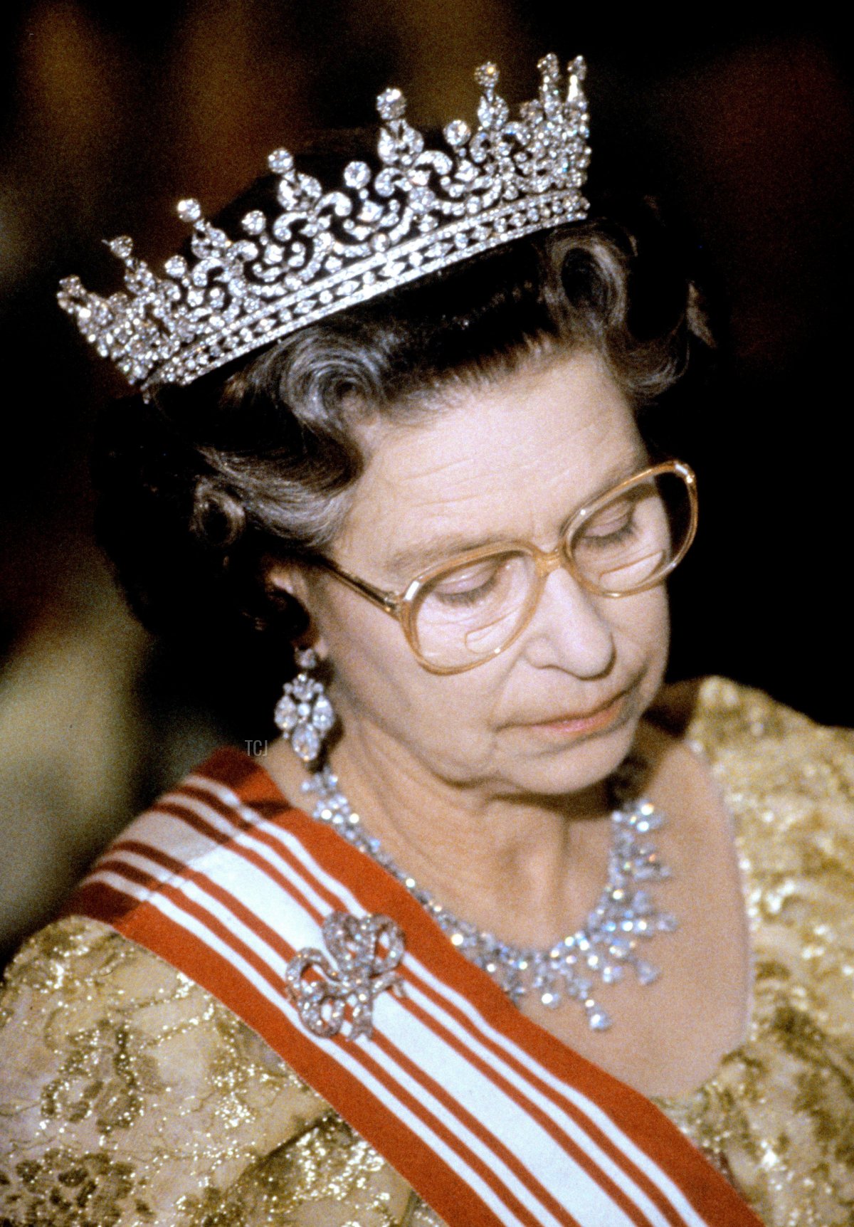 All week, we’ve been marveling at gala jewels worn by the Queen in each decade of her remarkable reign. Today, we’re making a stop in the 1980s, with a dazzling diamond ensemble worn for a banquet in Singapore.