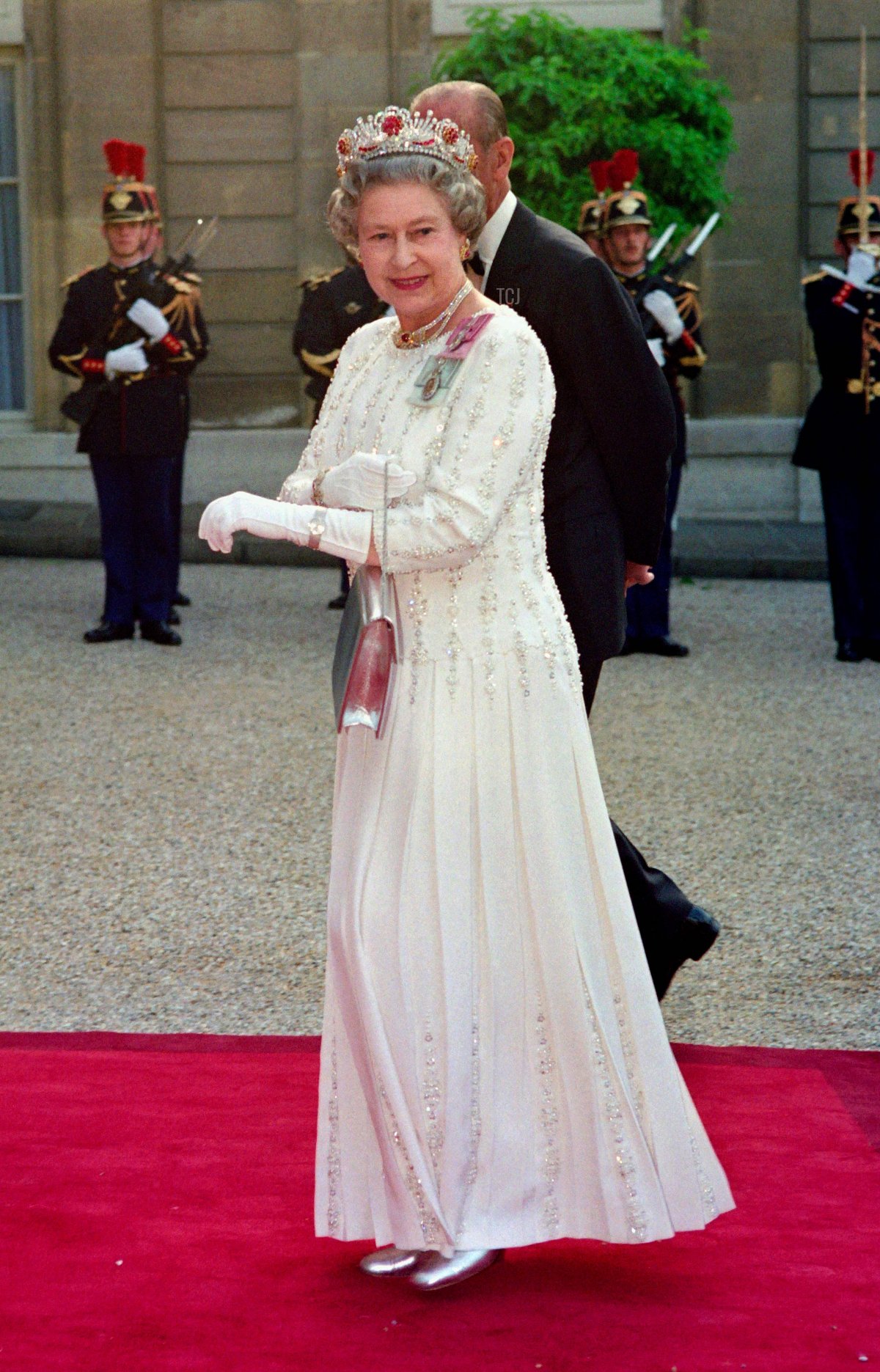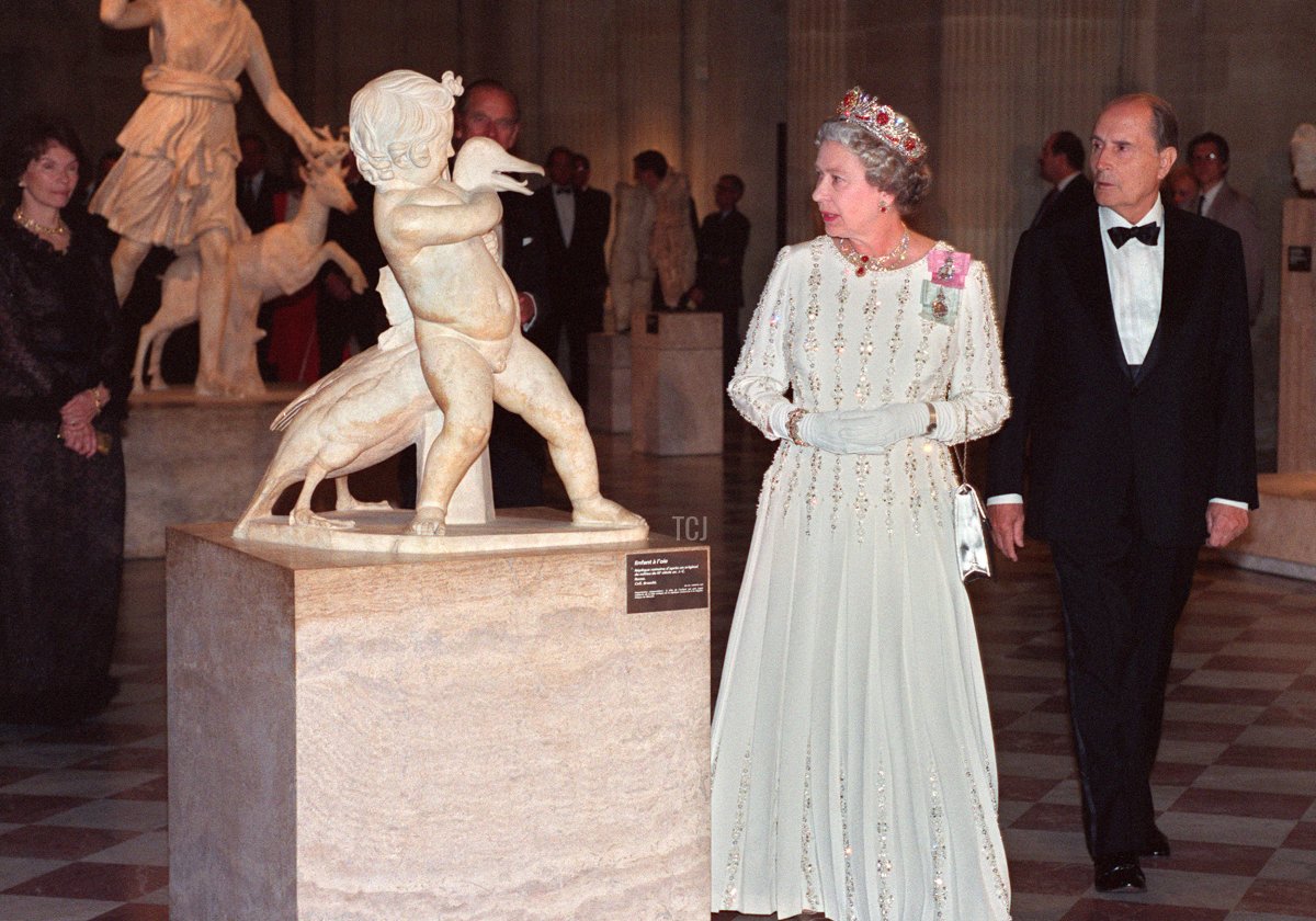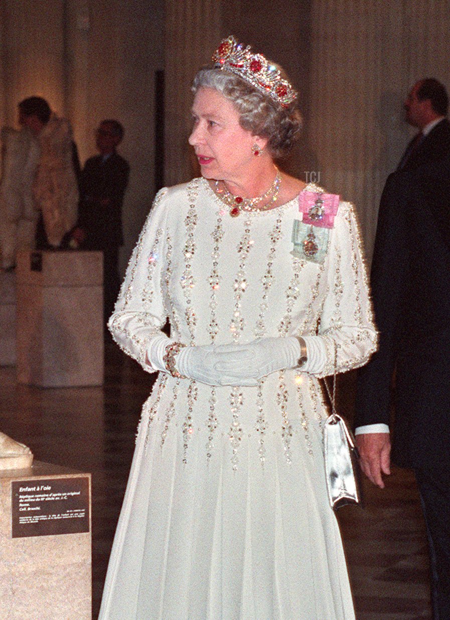 Our survey of the Queen’s sparkling gala appearances over the decades continues today with a look at a ’90s tiara moment in Paris. The Queen sparkled in diamonds and rubies for a state dinner and a special museum visit.