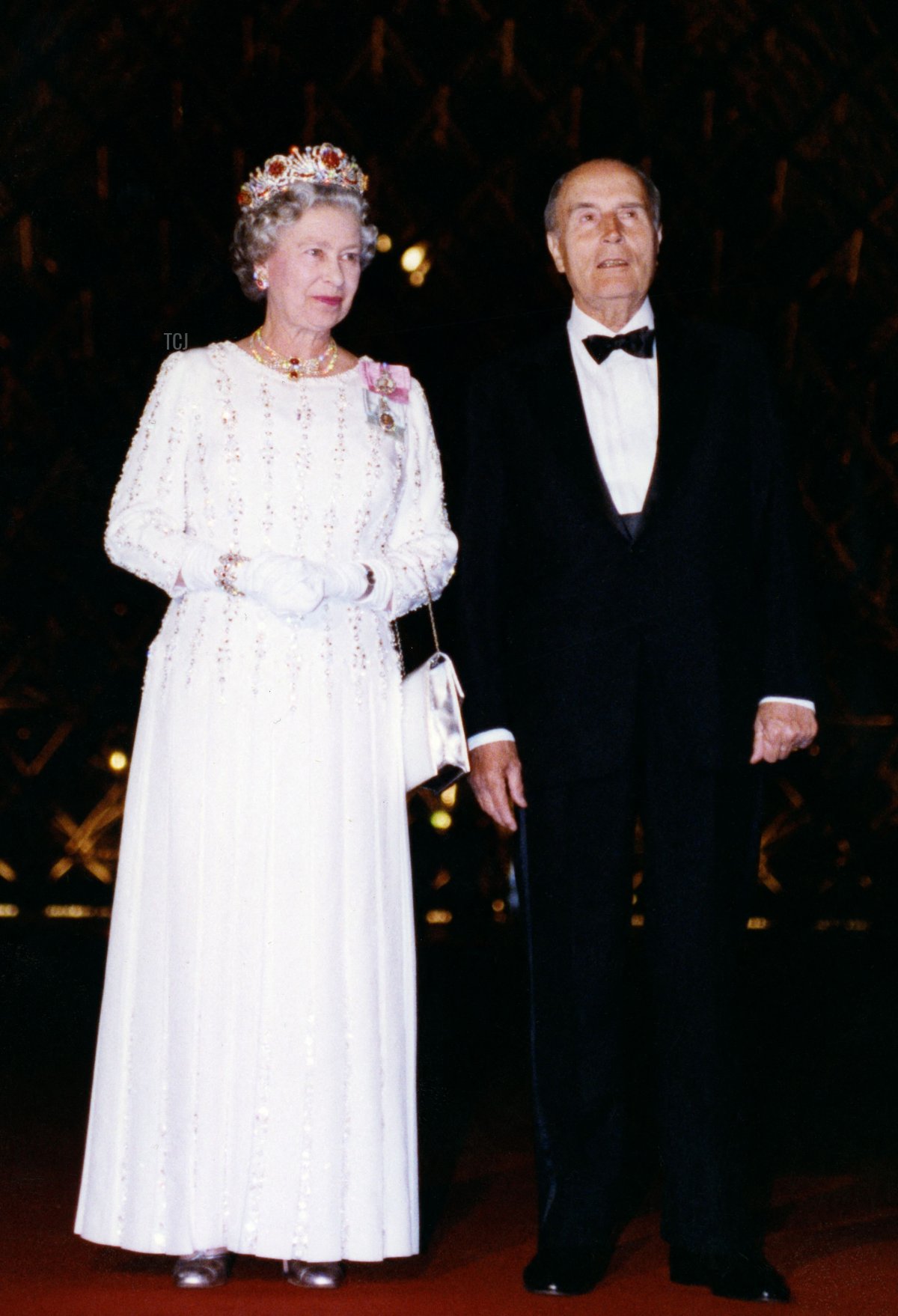 The evening also included a special tour of the Louvre Museum. Here, the Queen and President Mitterrand pose before the Louvre Pyramid, designed by I.M. Pei and completed in 1988.