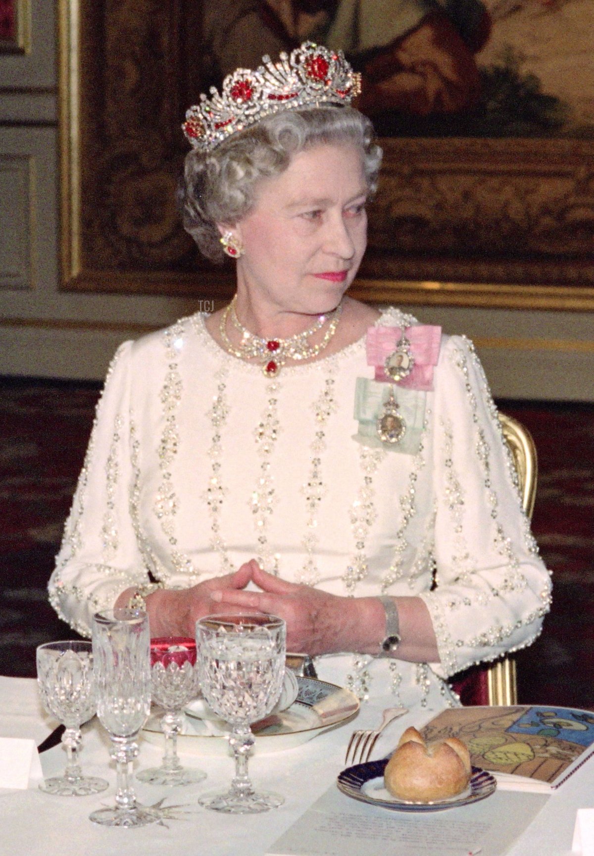With the gown, the Queen wore diamonds and rubies. The Burmese Ruby Tiara, commissioned by her from Garrard in the 1970s, was the spotlight piece of the ensemble. She paired the tiara with the Qatari Rubies. The necklace and earrings were presented to her in 1985 by Sheikh Khalifa bin Hamad Al Thani, who was then the Emir of Qatar.