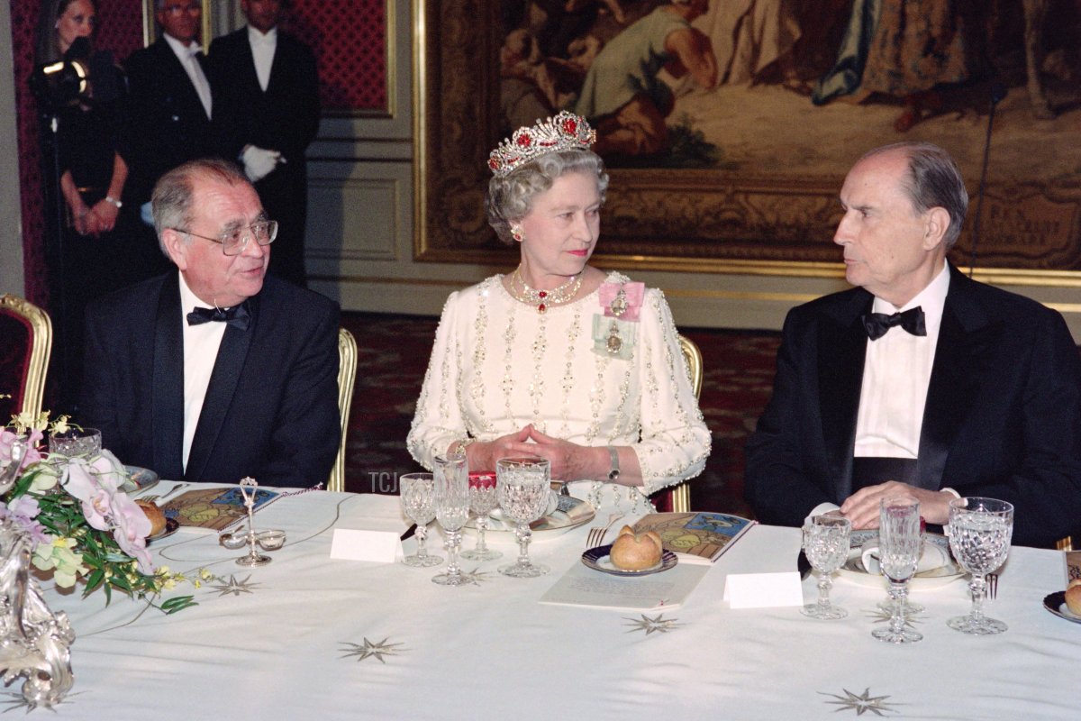 President François Mitterrand of France and his wife, Danielle, hosted the Queen and the Duke of Edinburgh for a state visit in June 1992. On the first night of the visit, the royal guests were feted with a state dinner at the Elysee Palace in Paris. Here, the Queen sits between Prime Minister Pierre Bérégovoy and President Mitterrand at the dinner.