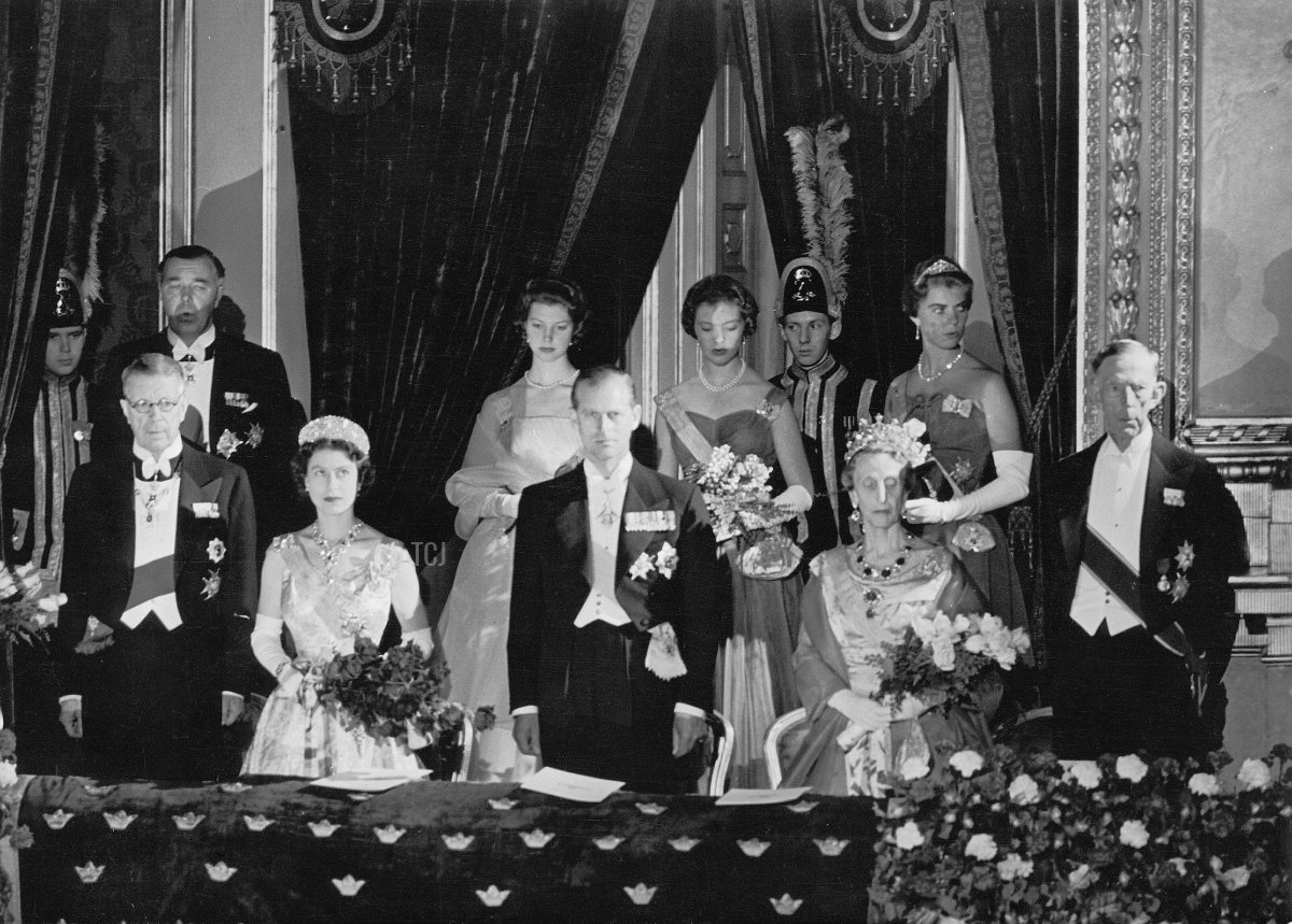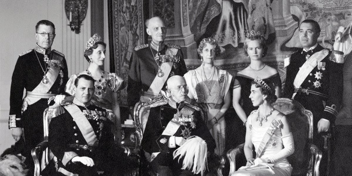 Before we move on, a quick ID of the royals in the photo, plus the additional jewels worn. Bottom row, left to right: King Frederik IX of Denmark, King Gustaf V of Sweden, and Queen Ingrid of Denmark (who wears the Pearl Poiré Tiara with additional jewels from the matching married parure). Top row, left to right: Crown Prince Gustaf Adolf of Sweden, Crown Princess Louise of Sweden, Prince Carl of Sweden, Princess Ingeborg of Sweden (wearing her Boucheron Pearl Circle Tiara and pearls), Princess Sibylla of Sweden (wearing the Connaught Diamond Tiara and a diamond rivière), and Prince Bertil of Sweden. (Queen Ingrid was the daughter of King Gustaf VI Adolf, so this was a family dinner as well as a diplomatic occasion.)