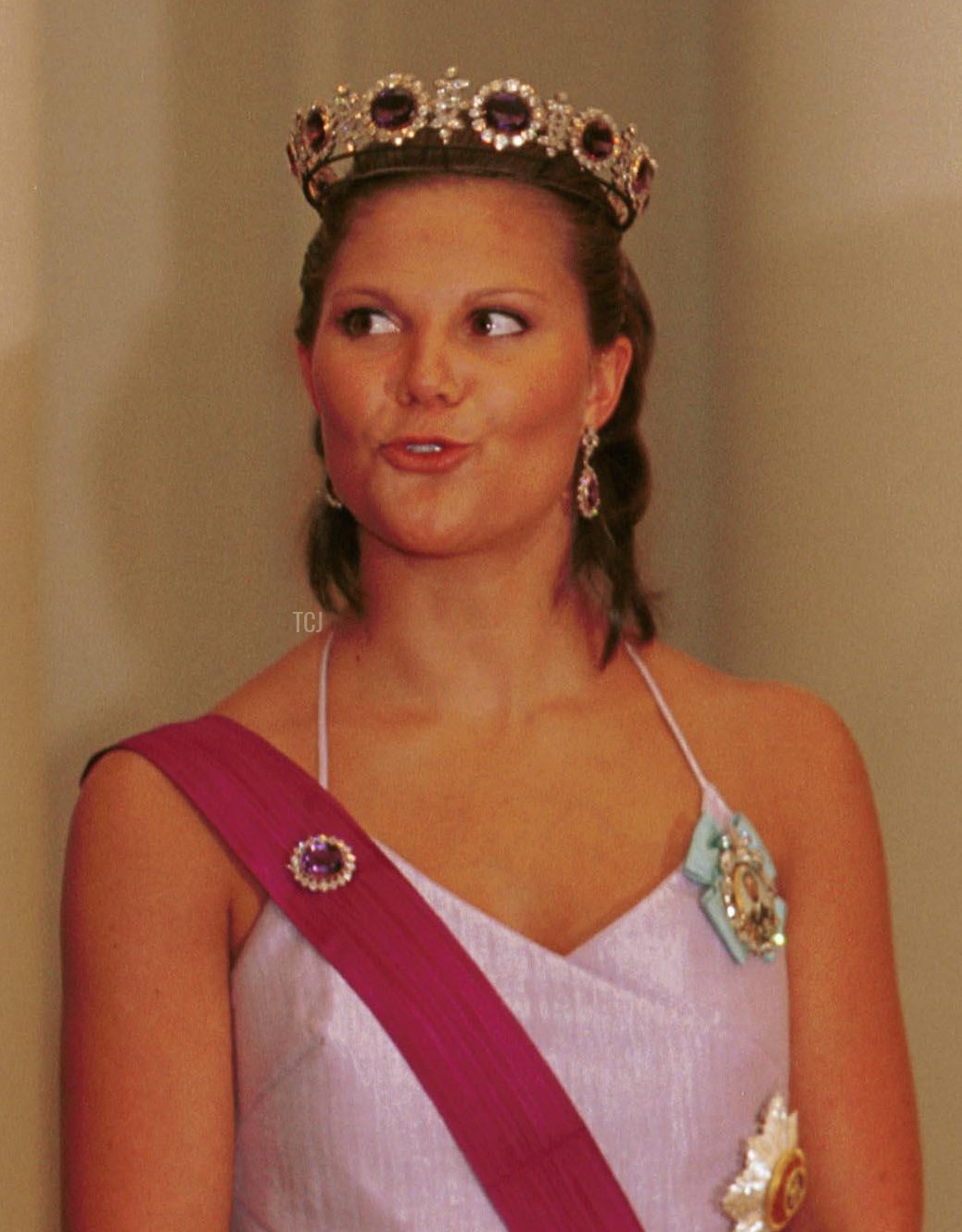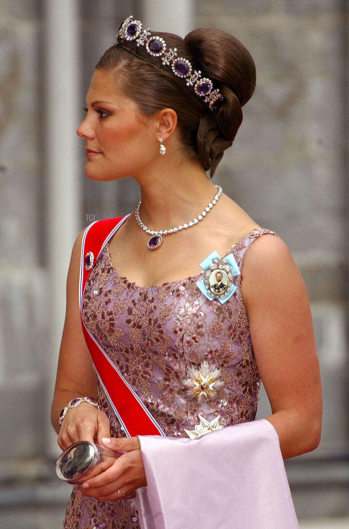 Over the years, Crown Princess Victoria’s appearances in the tiara have become more and more successful. Just a year later, in May 2002, she wore the tiara and additional pieces from the parure with a more complicated hairstyle. The occasion was the wedding of Princess Märtha Louise of Norway in Trondheim.