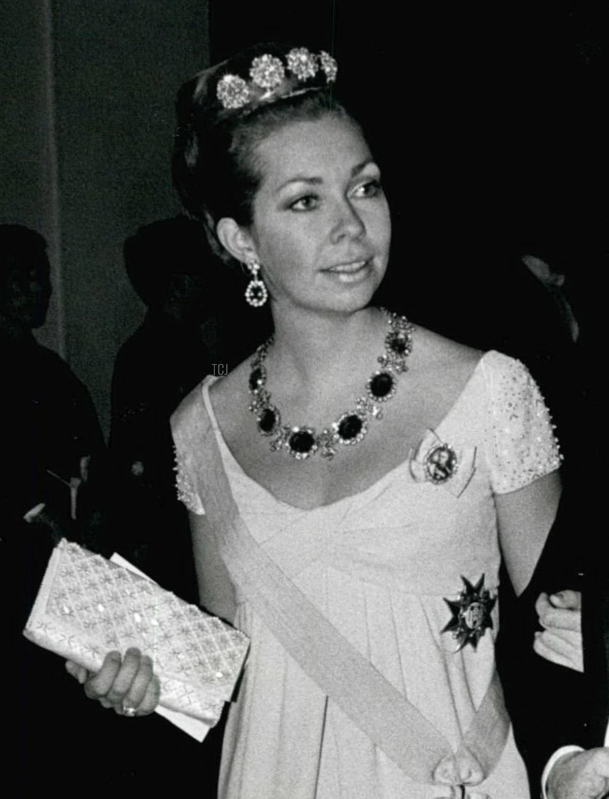After Queen Louise’s death in 1965, the amethysts were worn by her step-granddaughters, the Haga Princesses. Here, Princess Christina wears the necklace and earrings with the Diamond Four-Button Tiara for the Nobel Prize festivities in December 1968. Later, in 1976, Princess Margaretha wore the amethysts with Queen Sofia’s Tiara for the concert on the night before the wedding of King Carl XVI Gustaf and Queen Silvia. And in 2010, Princess Désirée wore the amethysts for the wedding of Crown Princess Victoria.