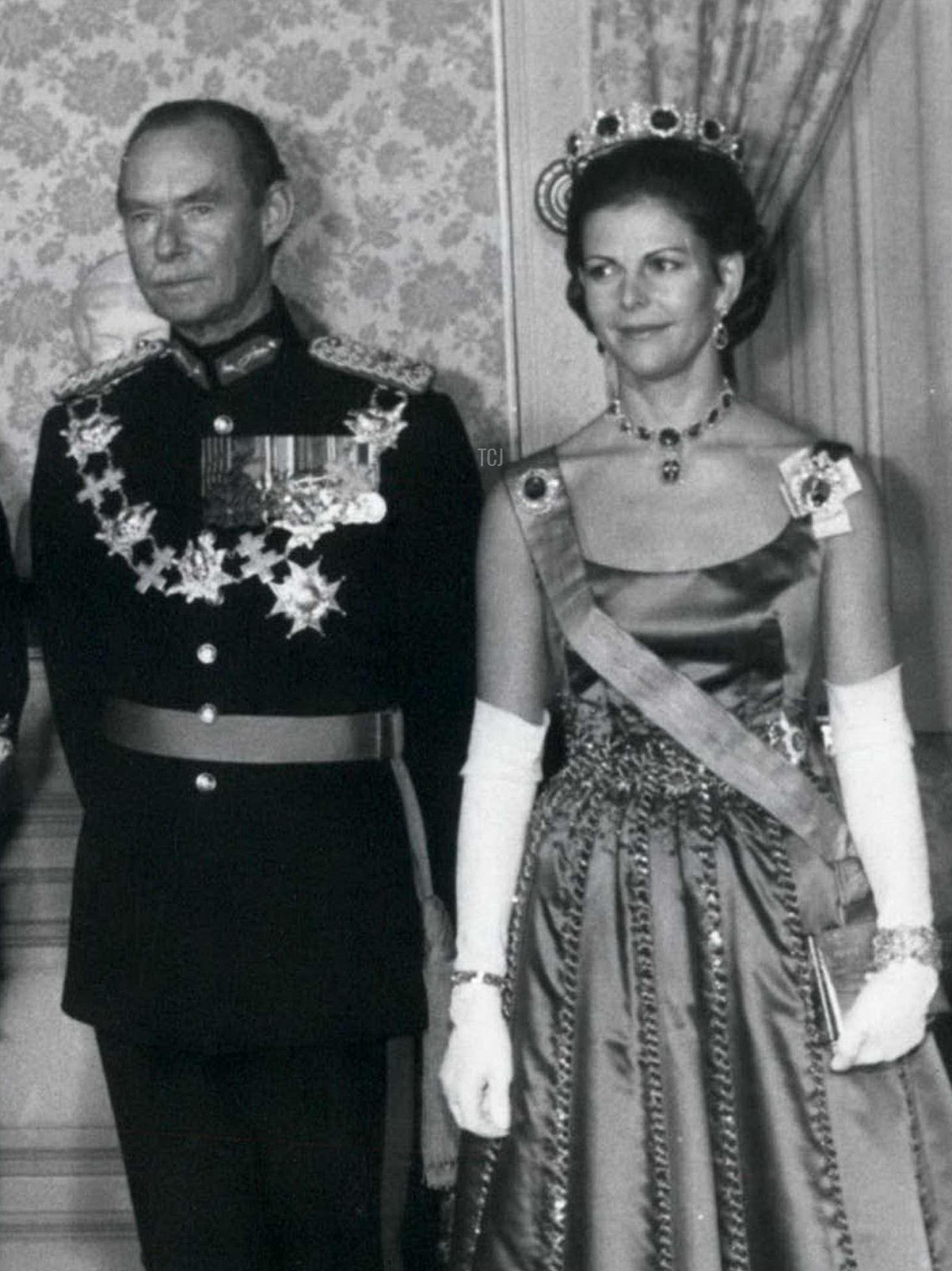 The photograph above shows one of Queen Silvia’s earliest appearances in the renovated amethyst parure. She wears the new tiara with the earrings and brooch for a dinner at the Spanish Embassy in Stockholm during a state visit from King Juan Carlos and Queen Sofia in October 1979.