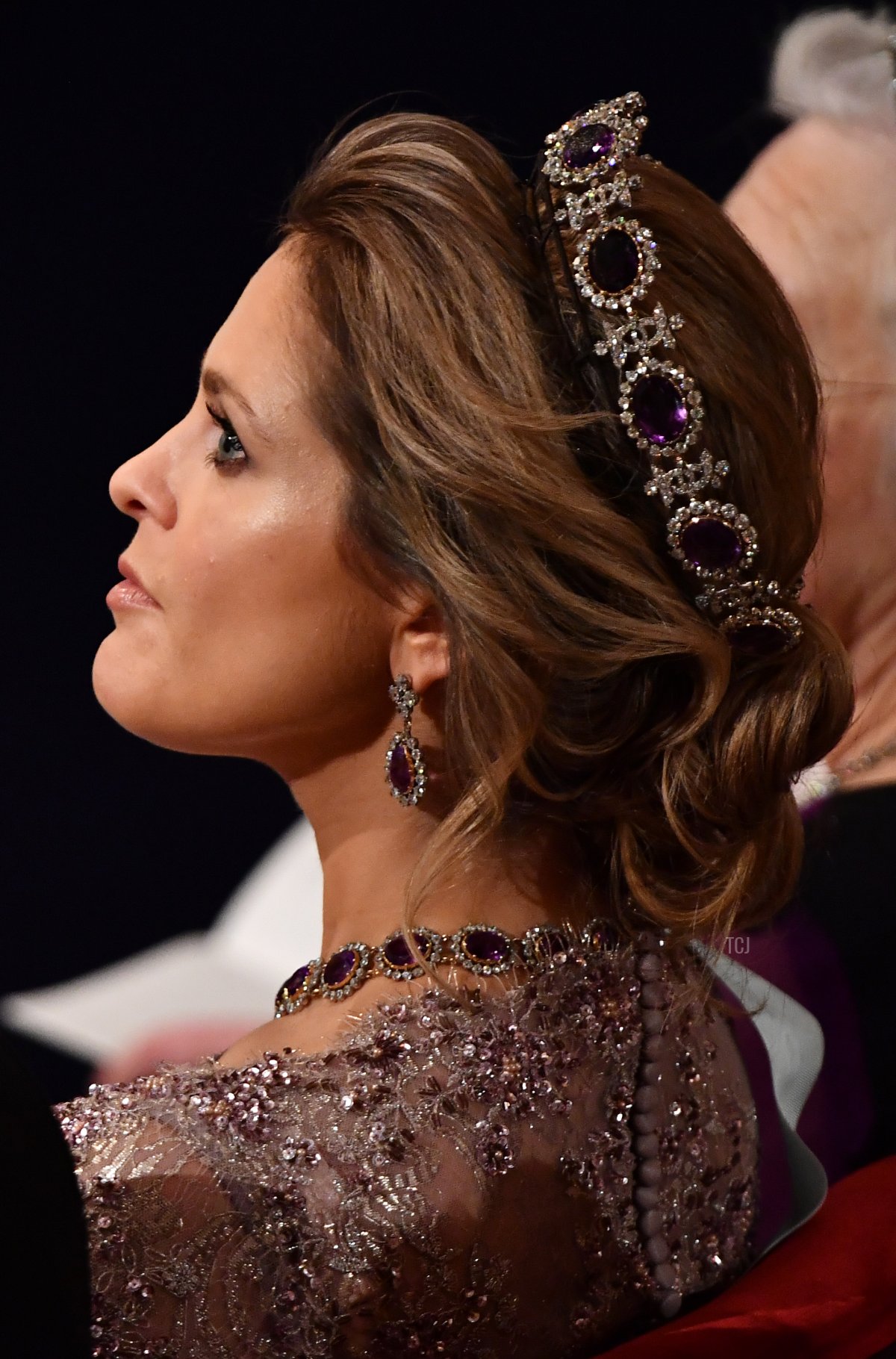 Princess Madeleine has worn the amethysts more than once for the Nobels as well. Here, she wears the tiara and earrings for the ceremony and banquet in December 2012.