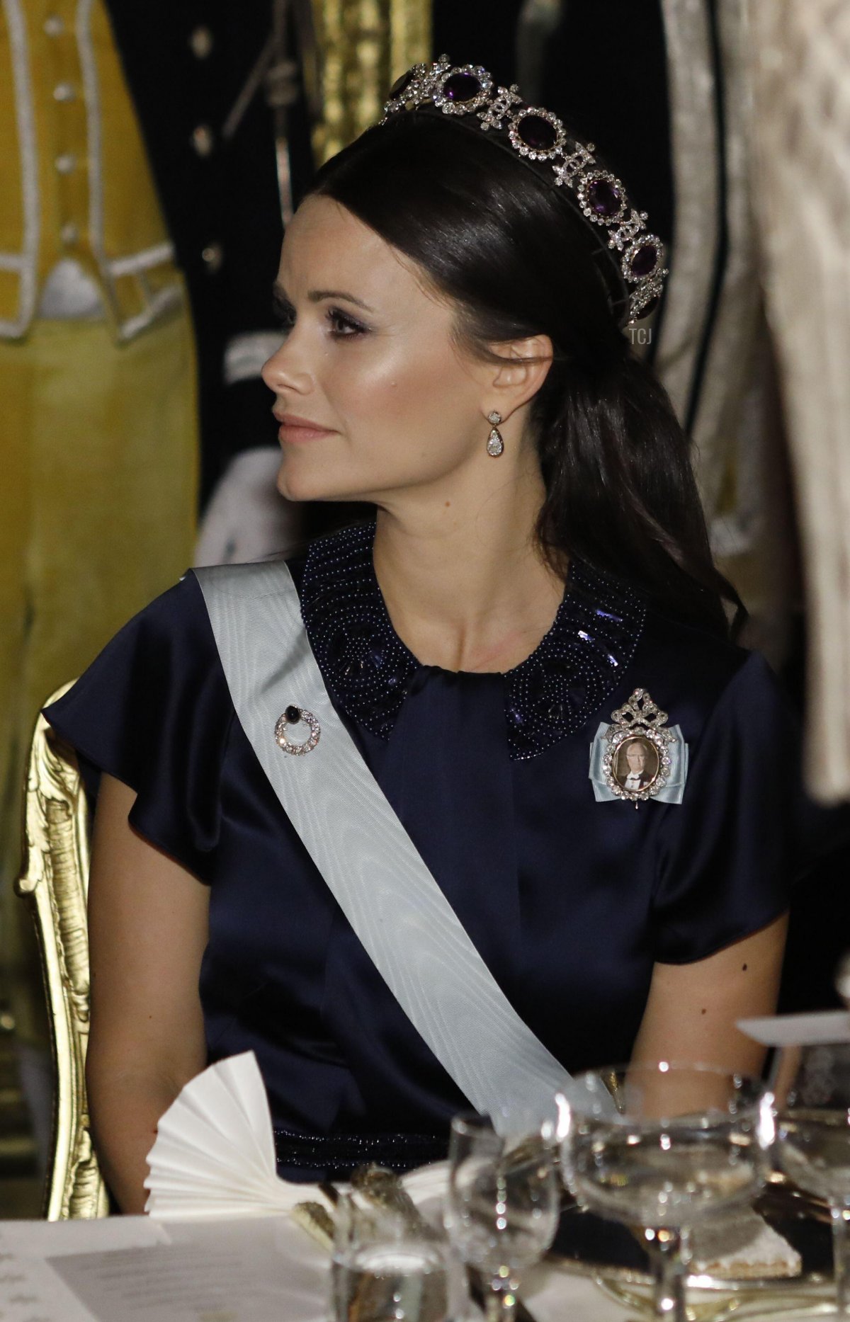 And in December 2019, she paired the amethyst earrings with the all-diamond setting of her palmette tiara for the Nobel Laureates’ Dinner at the Royal Palace in Stockholm.